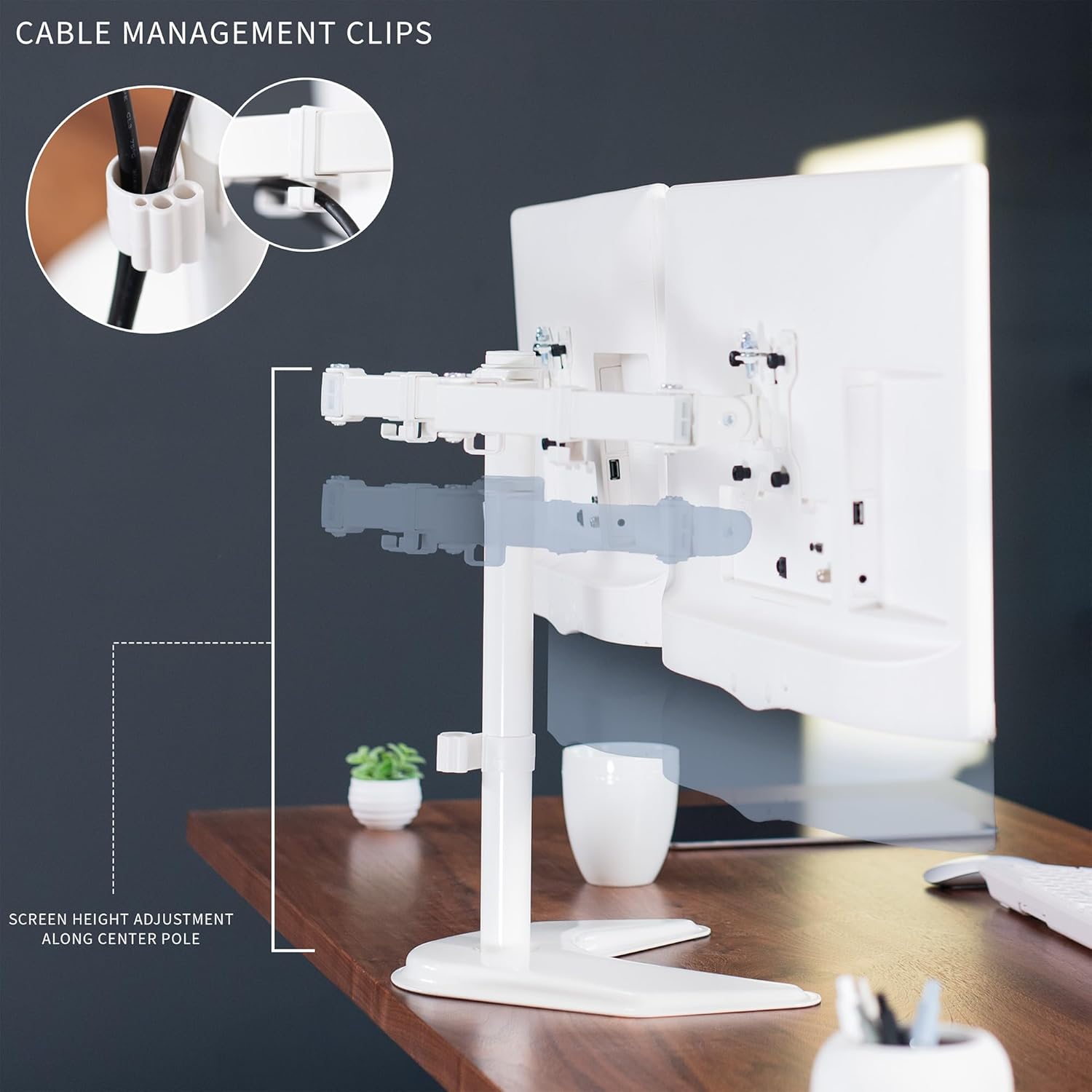 - Fits 13" to 27" Screens: Freestanding dual monitor mount holds two screens 13” to 27” and up to 22 lbs with 75x75mm or 100x100mm backside mounting holes. Keep power and AV cables clean and organized with detachable cable clips on the arms and center pole