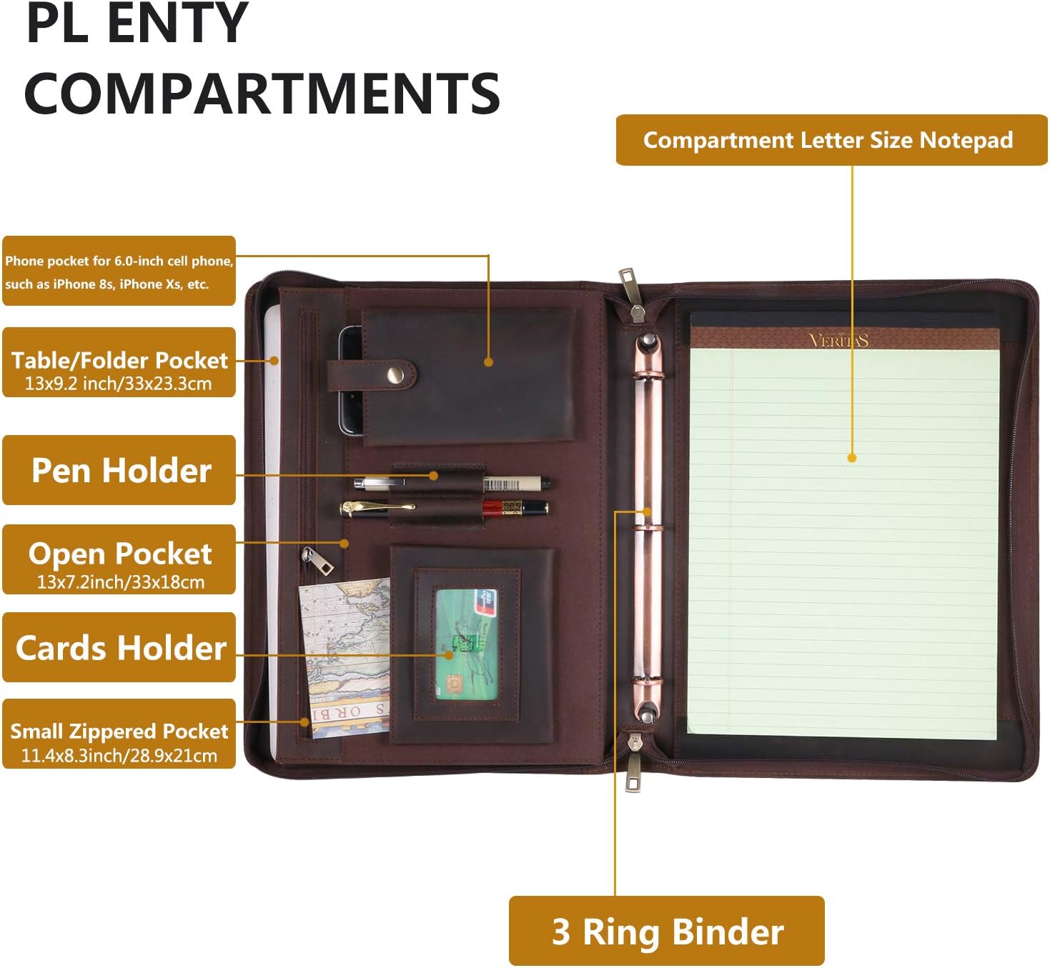 - GENEROUS PAPERWORK STORAGE–This leather padfolio for men designed for the standard US letter-sized 11”x 8 1/2” sheets, The 1-inch 3 ring binder could hold almost 80 sheets of Letter size Loose-Leaf Refills.