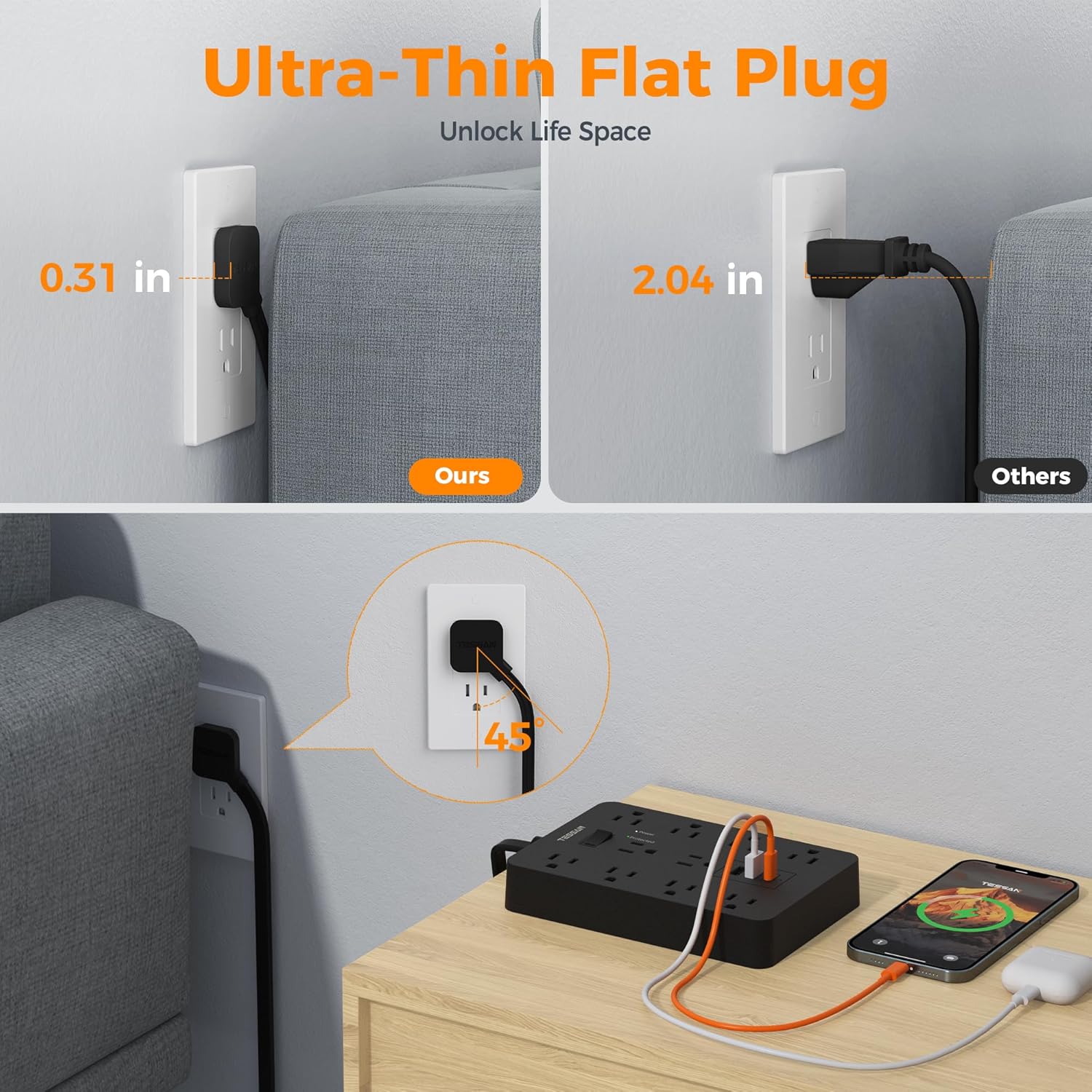 - 10 foot Long Extension Cord: With only 0.31 inch ultra slim design, Flat extension cord can fit in tight spaces more easily, hiding behind furniture, beds or refrigerators; 45° right angle design create an extra space for other plug below without blocking