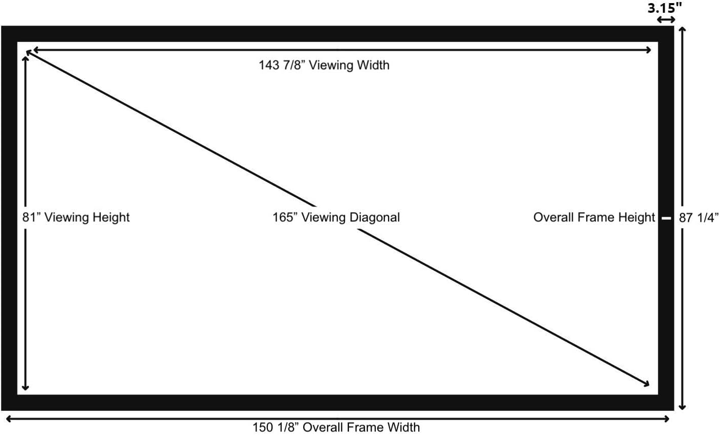 - Wall Mounted Fixed Frame Projection Screen (Overall Size 87.25" Tall x 150.125" Wide) (Viewing Area 165" Diagonal x 81" Tall x 143.875" Wide) No option for Legs or Stands with this product. Recommended for projectors with Native 16:9 Resolution