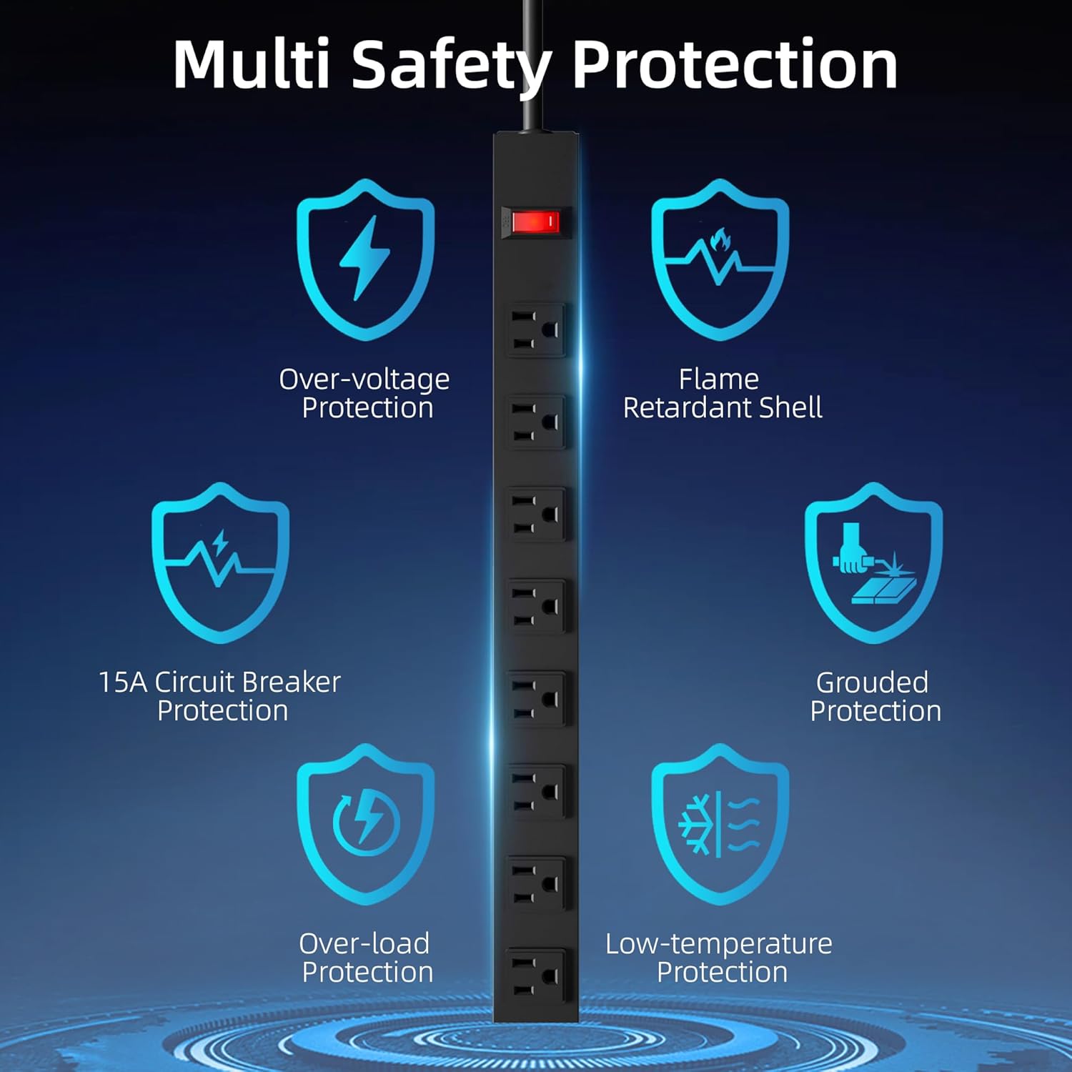 - OVERLOAD PROTECTION:A power switch with lighting has a built-in high quality 15A circuit breaker for overload protection. When the operating current exceeds the rated current, this power strip automatically cuts off the power supply from spikes, fires or other unsafe conditions.