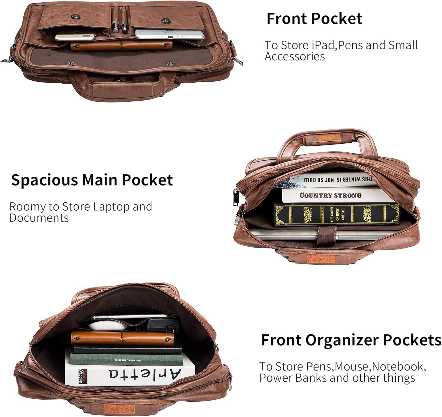 - LARGE CAPACITY - The men laptop briefcase includes external two pouches & two pen slots and inside several slots in front large pocket with adhesive hook and loop tape under flap over, storage penholders, documents, binder, power cords, mouse, two main zipper Pocket with foam padded sleeve fits most 15. 6 Inch laptop, back invisible zipper pocket for your valuables