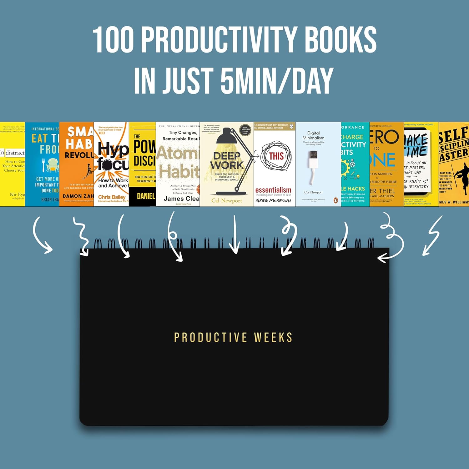 - 📚 100 BOOKS IN ONE PLANNER — distilled productivity hacks power goal setting, weekly priorities, habit tracking & daily task tracking, weekend agenda, dotted notes.