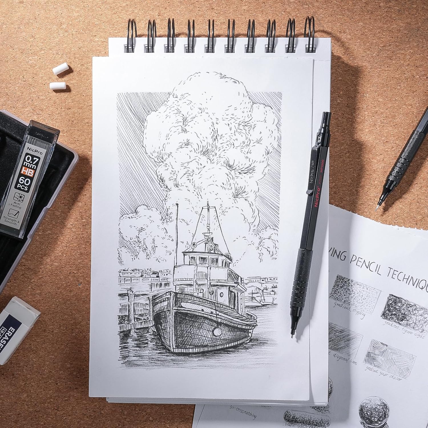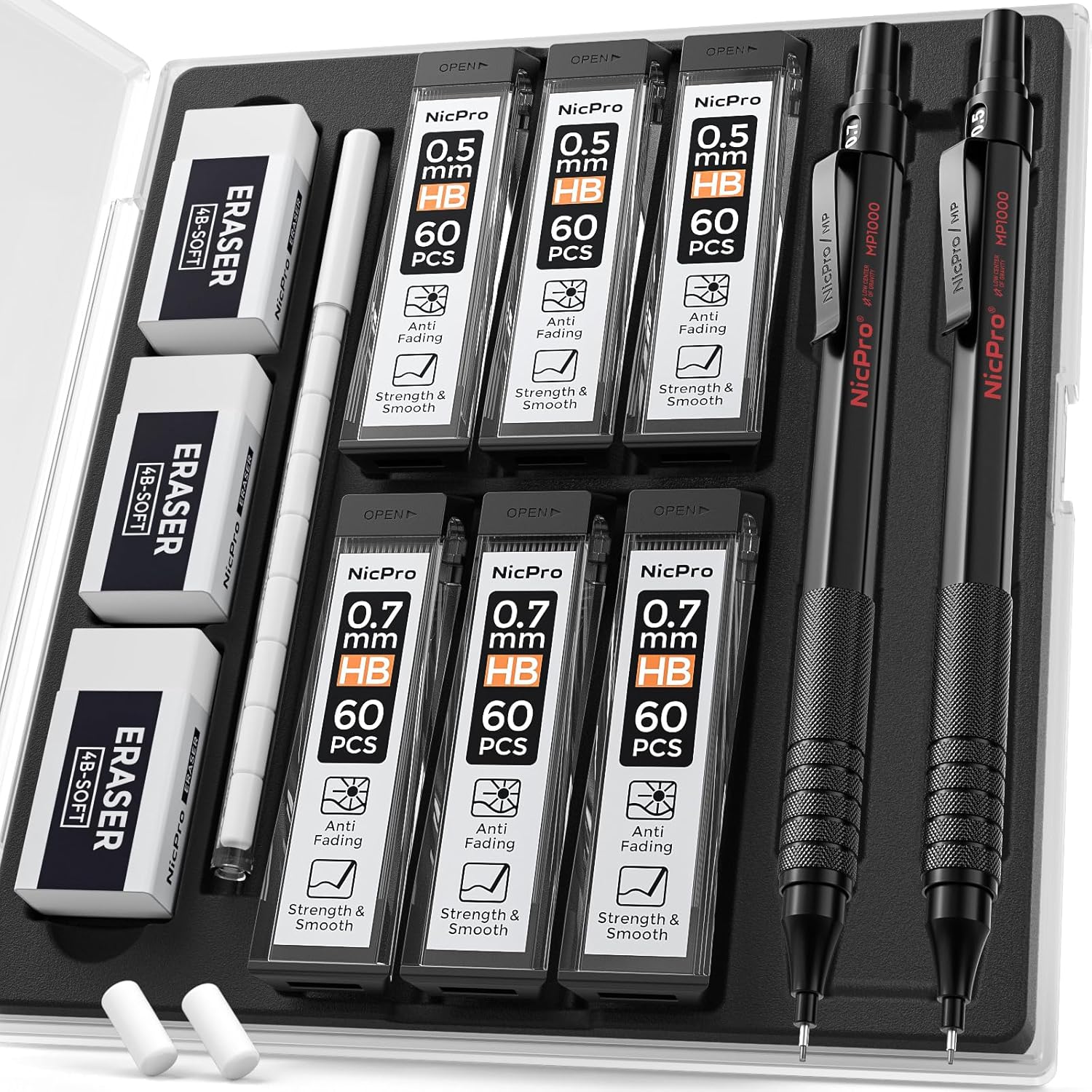 - Nicpro MP1000 Series: Come with 2 black different size 0.5mm and 0.7mm mechanical pencil, with 4 tube of HB #2 pencil lead, 2 pcs 4B-soft erasers, 9 pcs Eraser Refills in a storage case.