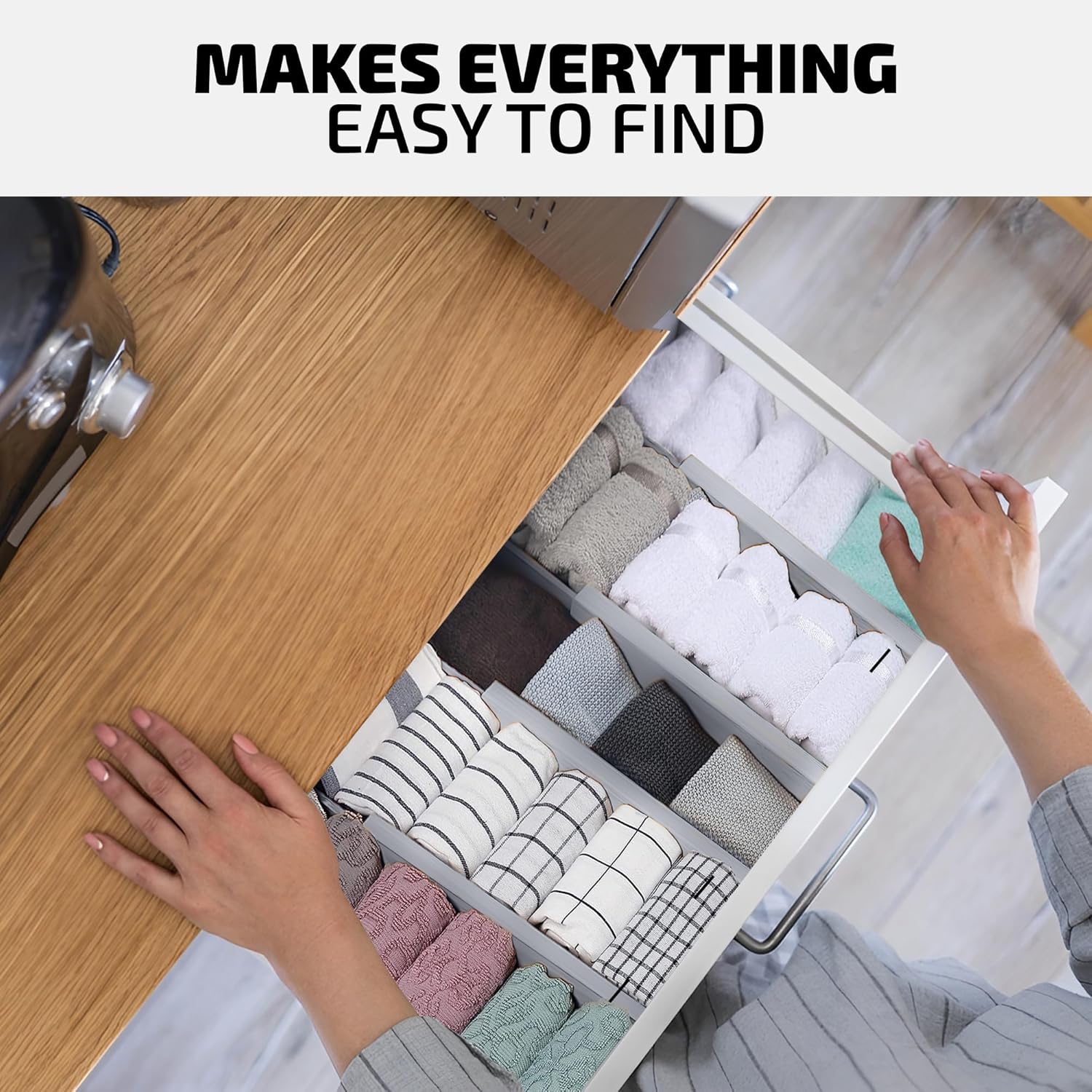 - Easy to Use with Added Protection: Simply slide the divider into place in any kitchen, bedroom, office, or bathroom drawer. Equipped with EVA foam padding, it protects your drawers from scratches and ensures the divider stays securely in place without slipping. Achieve organized storage in seconds, with the flexibility to remove or reposition as needed.