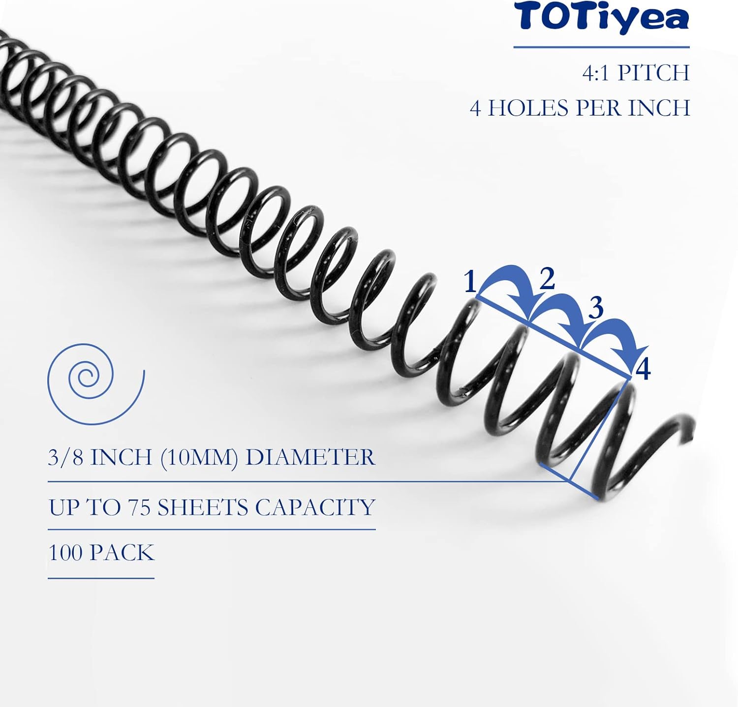 TOTiyea 100 Pack Plastic Spiral Binding Coils, 10mm(3/8") Binding Spirals, 75 Sheet Capacity, 4:1 Pitch, Black