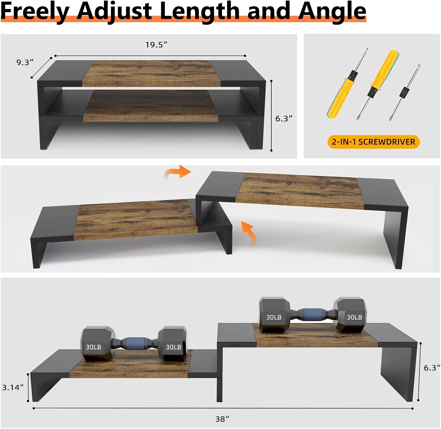 - ❤Angle and Length Adjustable: Freely adjust length and angle, the length of computer stand can be adjusted from 18.9 inch to 38.4inch. It can be used at both L desk and regular tables. The adjustable height and Angle gives you a comfortable office experience.
