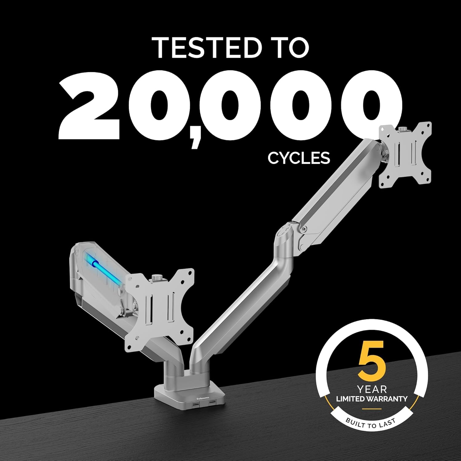 Fellowes Platinum Series Dual Monitor Arm for 40-Inch Monitors, Full Motion, 360° Rotation, VESA Mount with Grommet or Clamp, USB Ports, Ergonomic, Silver, 8056501