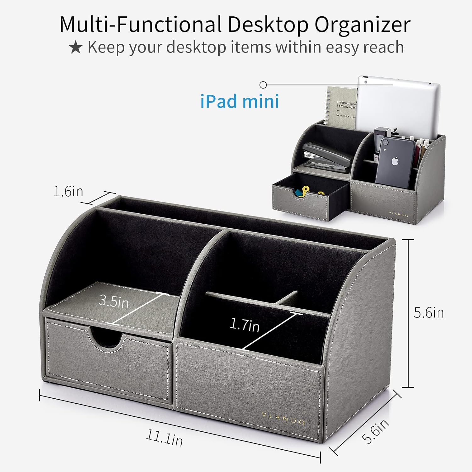 Vlando Desk Organizer with Drawer, Back to School Supplies - 5 Compartment Desktop Storage Holder with Organizer Section for Desk Accessories (Gray)