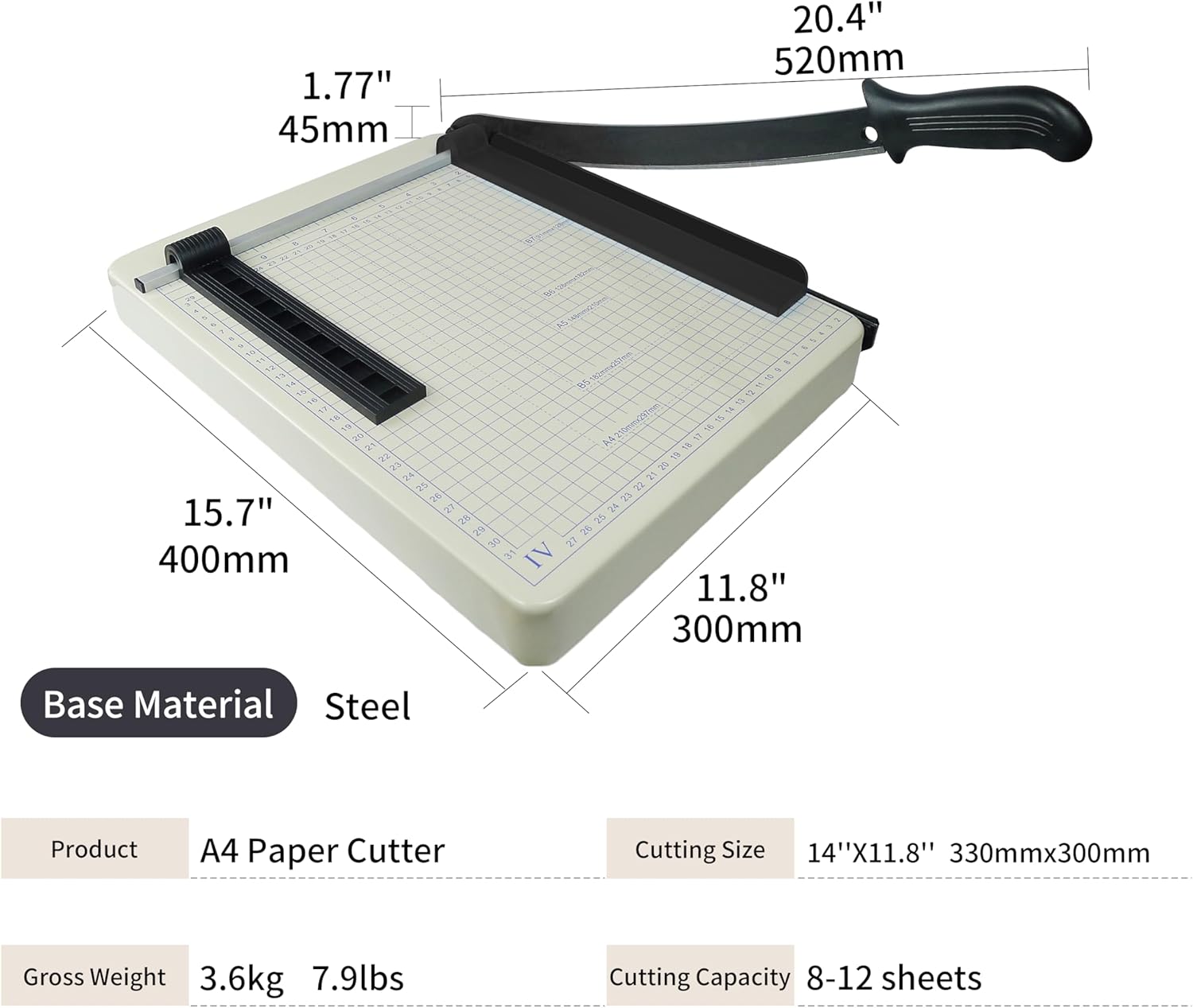 - [MATERIAL AND SIZE]: 10" x 12" Metal Base; steel cutting blade
