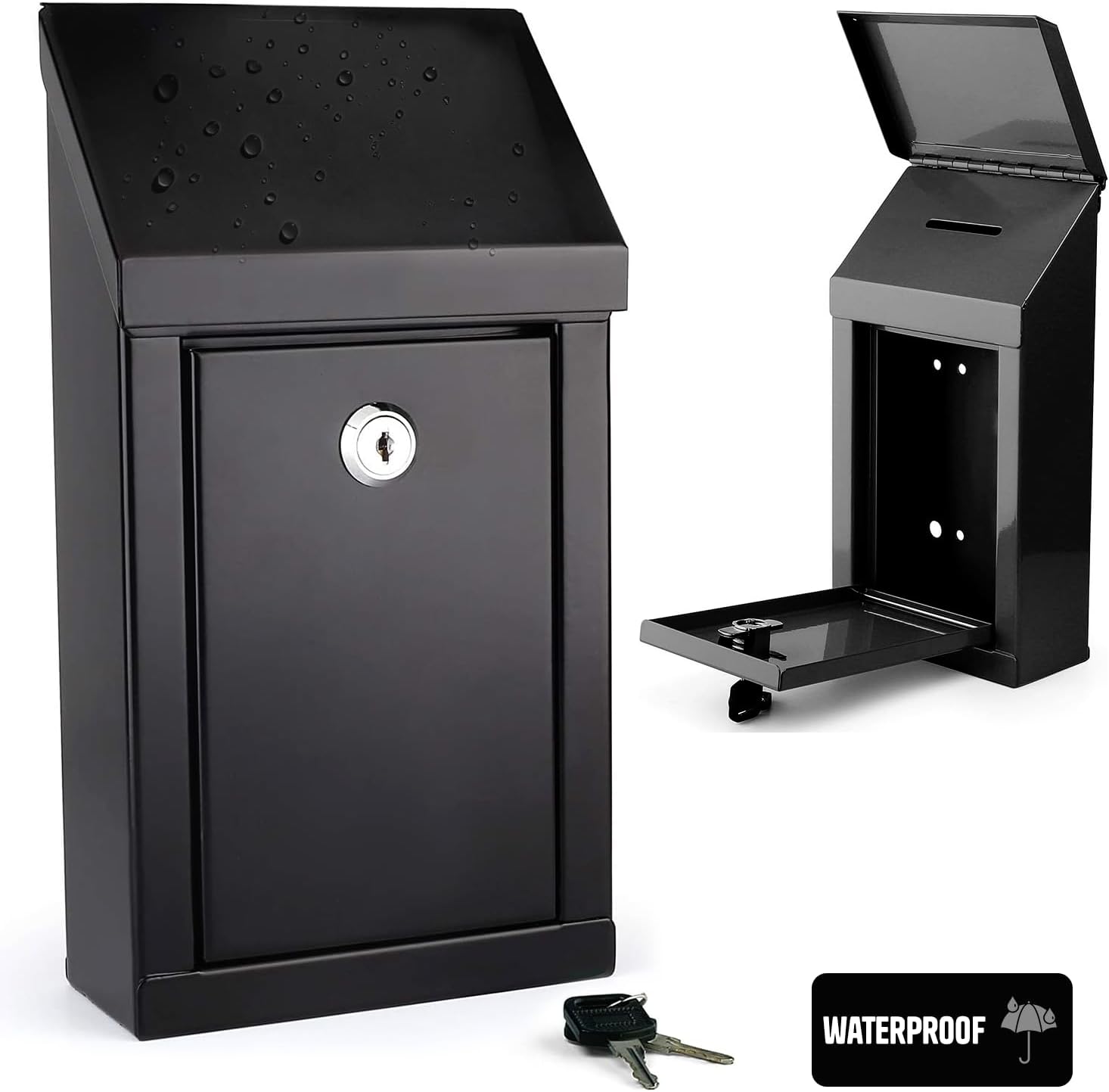 Metal Donation Box-Suggestion Box with Slot and lock-Cash Lock box for Money-Waterproof Drop Box-Comment and ballot voting box-comes with pre-drilled holes for easy wall mounting 10x6x2.5"(Black)