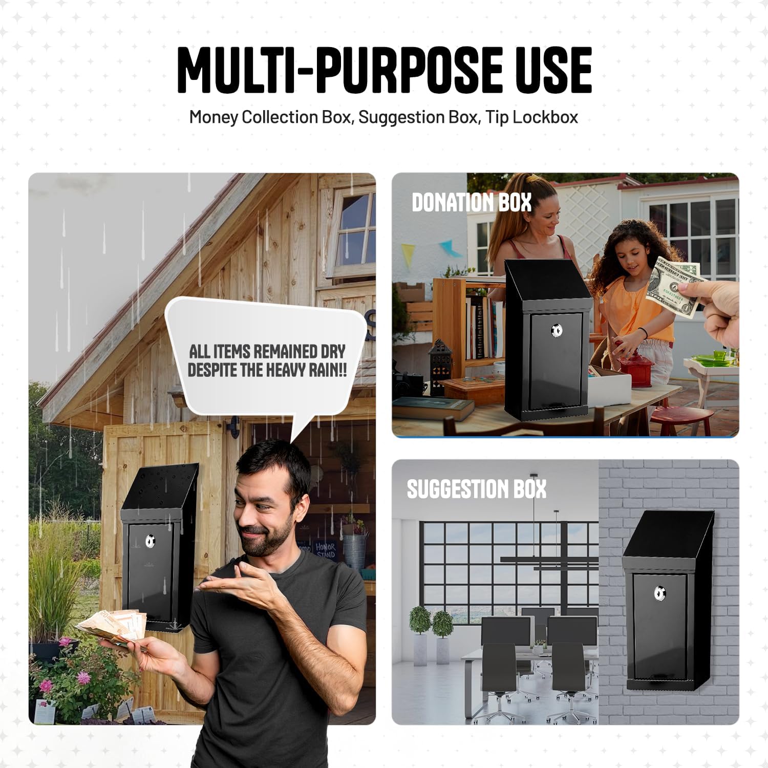 - Secure donation box, easy to mount on walls or counters