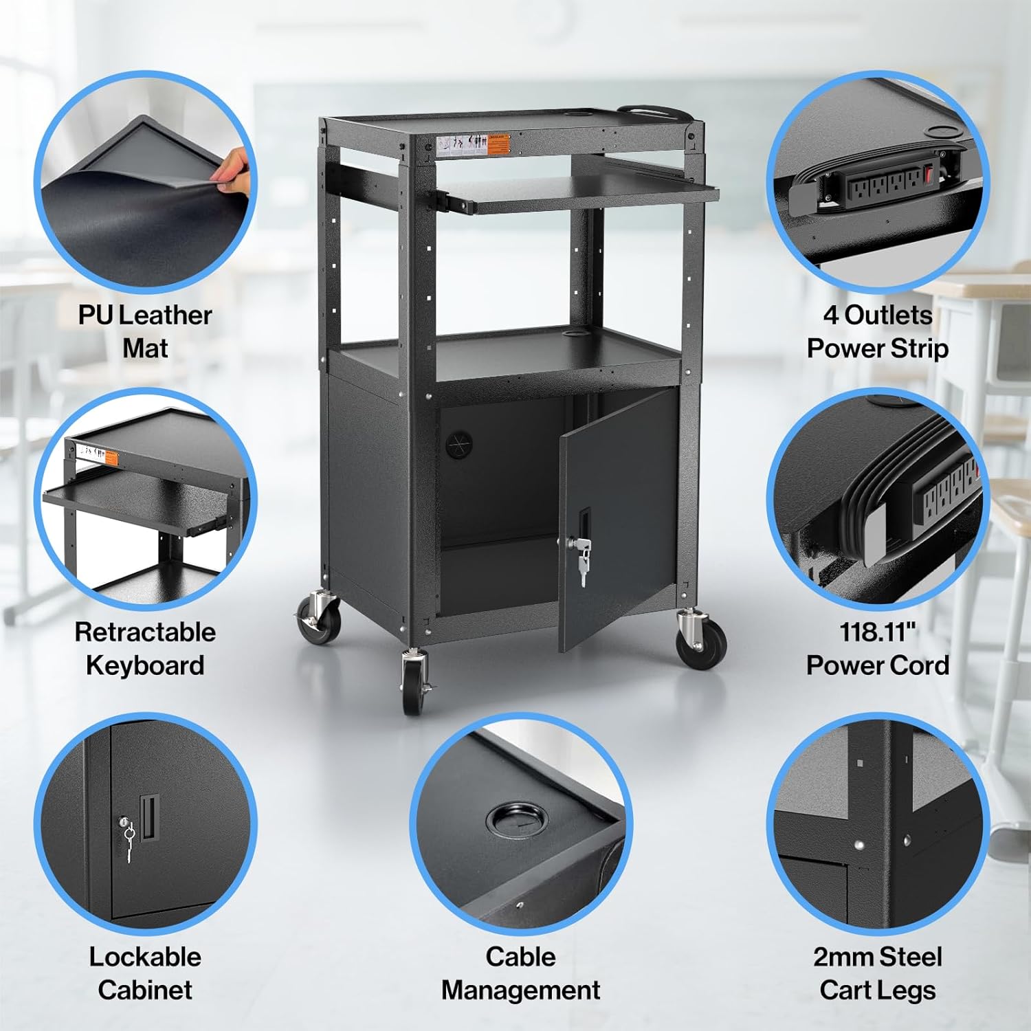 - MULTIPURPOSE: Our projector cart comes with a built-in power strip with 4 outlets, a 118.11" power cord to charge multi devices over long distances. Equipped with a pullout tray, PU leather mat and cord management wrap to enhance your using experience. The practicality of this rolling computer cart can also be use as standing desk, mobile laptop work station or mobile home office.
