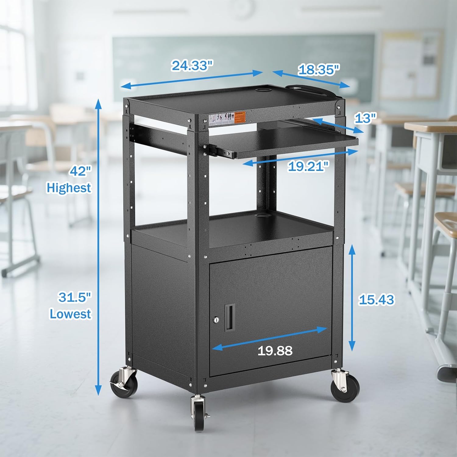 - METAL AV CART WITH LOCKING CABINET: POCHAR rolling media cart is made of durable cold-rolled steel for high stability, ensure the wear-resistant and sturdiness for daily high-intensity use. This utility cart features a locking cabinet, which this storage space can store a large number of files, while also ensuring the safety of valuable equipment or important documents.