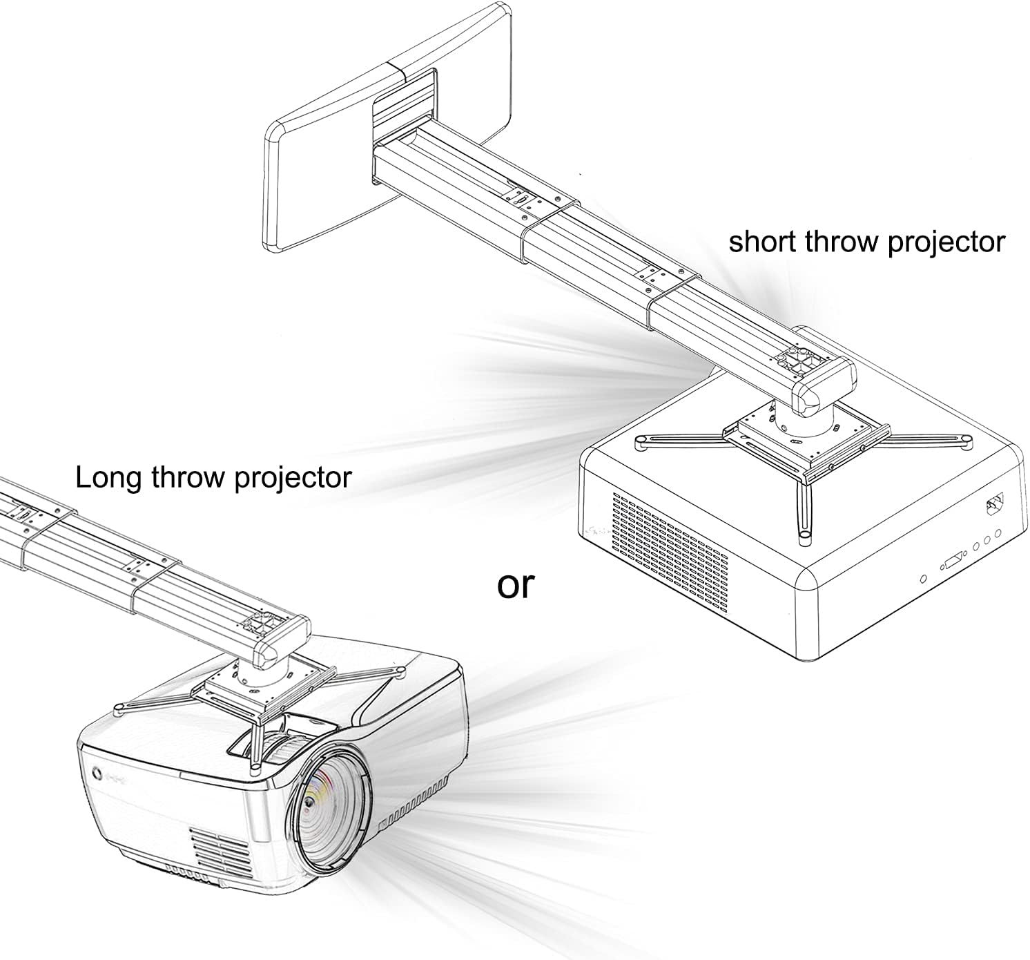 - The mounting plate of the projector bracket has four adjustable and freely retractable horizontal axis mounting arms, which is a universal mounting bracket for ultra short distance projectors. The maximum distance between mounting holes on the back of the projector must be less than 12.5 inches