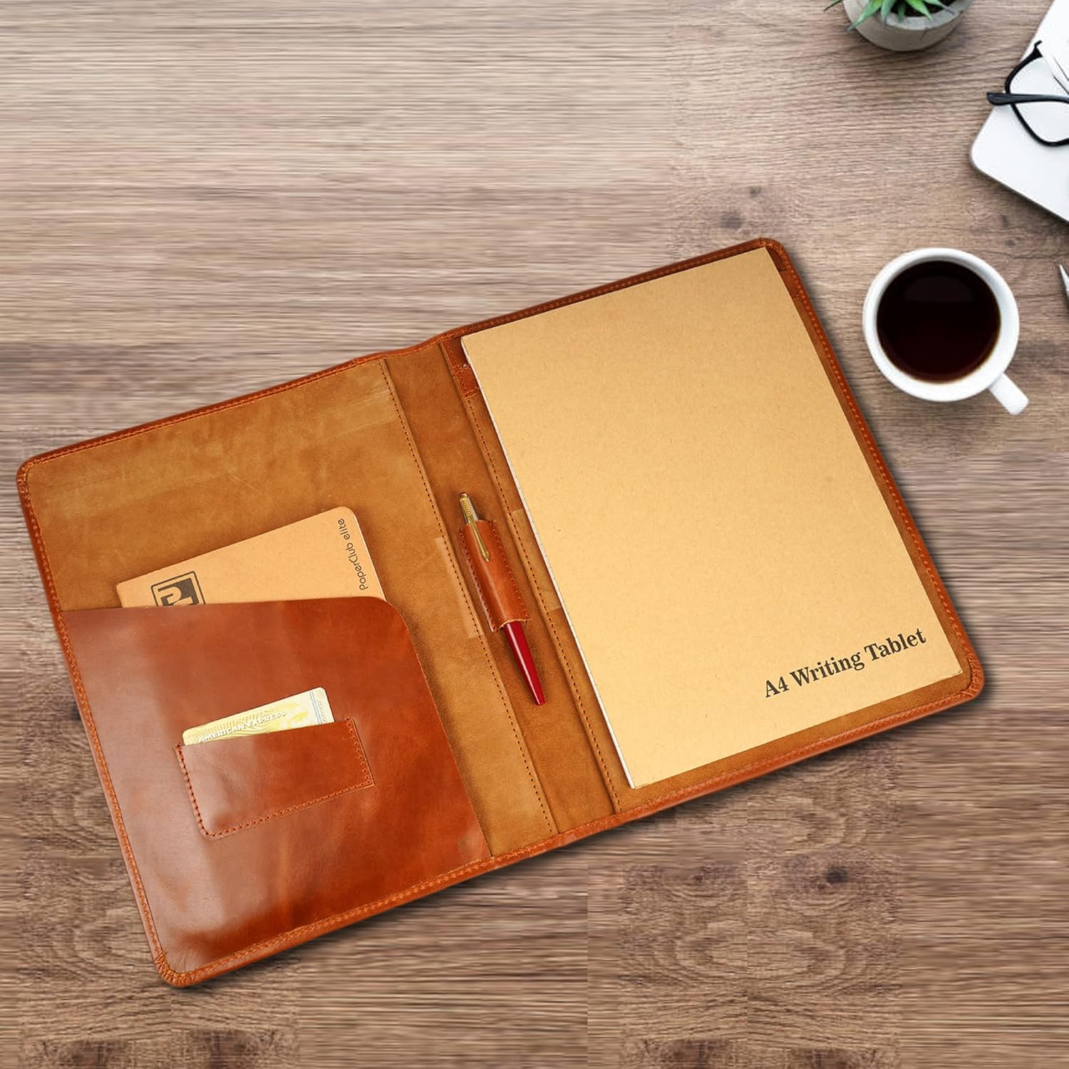 - PERFECT STORAGE - Leather folder with the size of 13” x 10”, give you a plenty of storage. A sleeve holder perfect for the legal pad writing pads and A4 notepads & paper sheet, 1 pen slot, 1 wave-shaped business card holder and 1 side pockets for documents. This wonderful leather notepad construct without annoying zipper will organize your paper stuff very well. And what is more, it will add your confidence and great first impression definitely.