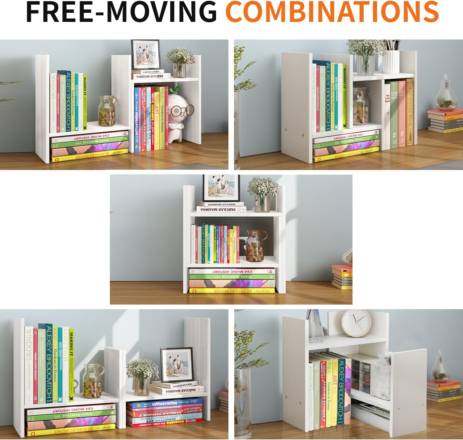 YSJILIDE Wood Adjustable Small Desktop Bookshelf, Expandable Storage Organizer, Organizer Office Storage Rack, Display Shelf Rack, Office Supplies Desk Organizer(White)