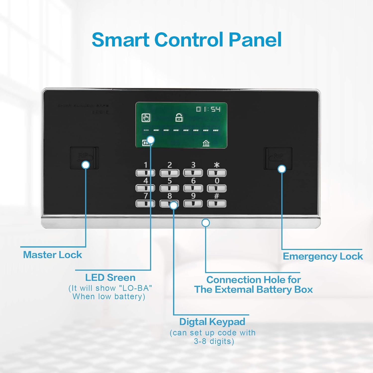 - ✅【SMART WARNING SYSTEM】: Security Safe can keep max 35 opening records, and allows you to program your own code with 1-8 digits; Dial “*” before enter the code can active the secure display feature (the code you enter into will not been shown on the screen), Violent vibration or Three- incorrect entries can activate the alarm system by sounding for 60 seconds.