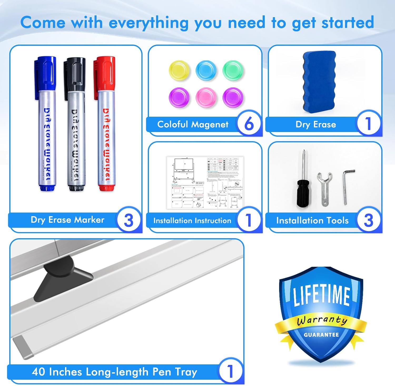 - Solid Construction & No Wobble: The rolling whiteboard is crafted with highest quality materials, including rust protective coating, strong ABS corners and solid frame construction. All these make the white board long-lasting and safer to use. The large white board is equipped with 4 universal wheels for easy moving on hard floors or carpet. It is fortified with casters with locking brakes, so the wheels can be locked, making it stable when writing and wiping