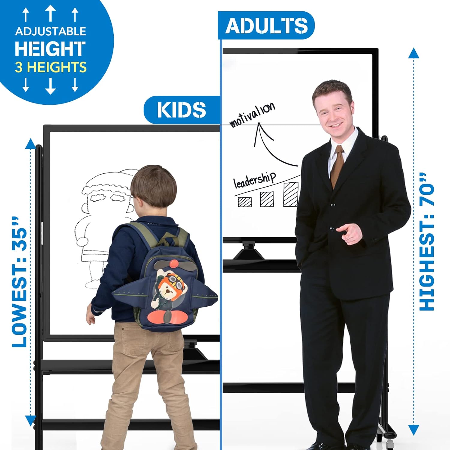 - 【Double-Sided Mobile Whiteboard】The writing surface measures 48 inches x 36 inches, while the assembled frame dimensions are 52 x 50 inches. This reversible dry erase board features a button-activated flipping mechanism for maximum writing space utilization. Equipped with four durable 360-degree locking casters, it allows smooth mobility and secure placement.