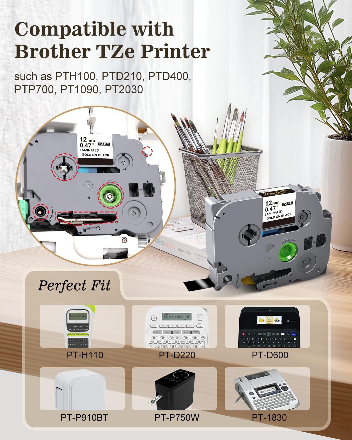 - Label Maker Gold Tape Compatible with Brother P Touch Label Makers: PT-D210, PT-D200, PT-D400, PT-D400AD, PT-1280, PT-1290, PT-D220, PT-H100, PT-H110, PT-D410, PT-D450, PT-D460BT, PT-E500, PT-D600, PT-D610BT, PT-P750W, PT-D800W, PT-1180, PT-1190, PT-1290, PT-1880, PT-1230PC, PT-1750, PT-1800, PT-1890W, PT-1950, PT-2030, PT-2430PC, PT-2700, PT-2730, PT-6100, PT-9600, PT-P700, PT-P710BT, PT-H300, PT-H500LI, PT-1100, etc. Note: Ptouch TZ tape is different from ptouch m tape.