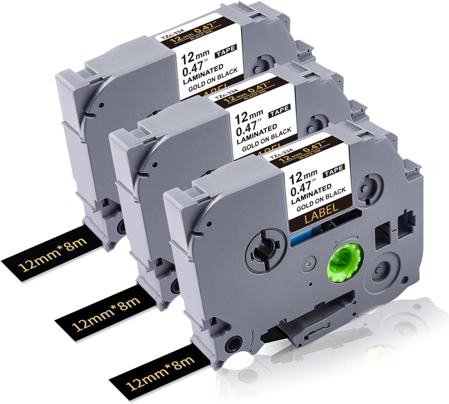 - Packages: 3-Pack Lonitul P touch label tape gold on black compatible with Brother Ptouch Tz tape 12mm gold on black Tze-334. Size of each tape: 0.47Inch x 26.2Feet (12mm x 8m).(Tze334 is not a M tape and is not compatible with Brother M printers.)