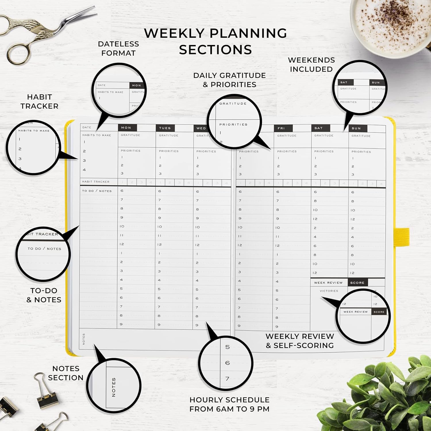 - ✅ LUXURIOUS QUALITY: We know you appreciate quality so we chose a bleed proof paper to make sure the ink won’t bleed onto the pages. The inner pages contain monthly calendars, daily schedules, goal setting, weekly scoring, to-do lists, notes sections, habit tracking and gratitude affirmations.