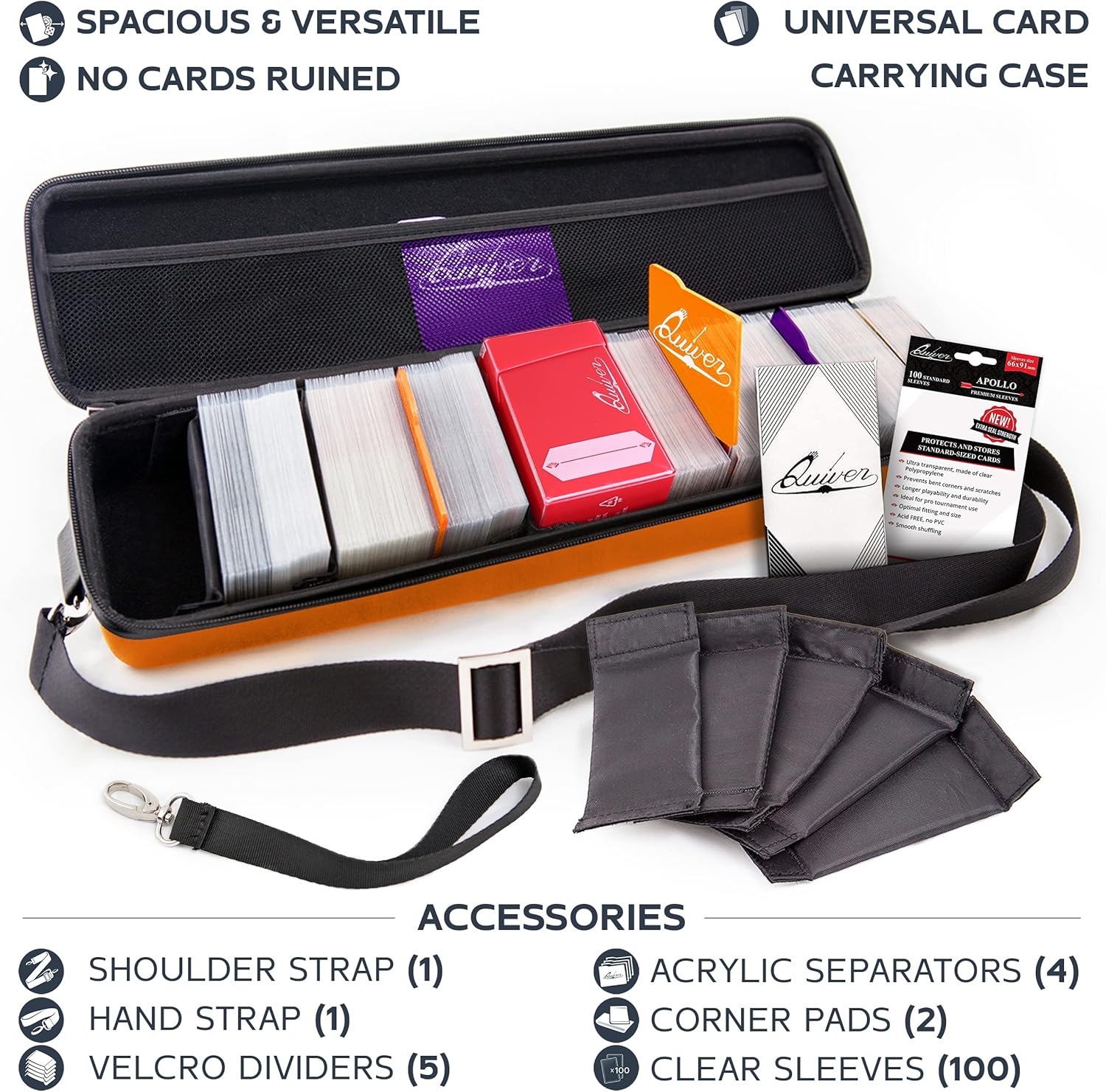 - Durable, High-Capacity Trading Card Storage: The Quiver Orange Deck Carrying Case holds over 1350 unsleeved standard trading cards, perfect for serious and casual collectors. Equipped with 4 durable acrylic separators, 5 adjustable Velcro dividers, and 2 removable corner pads, it offers customizable organization and superior protection against wear and tear.