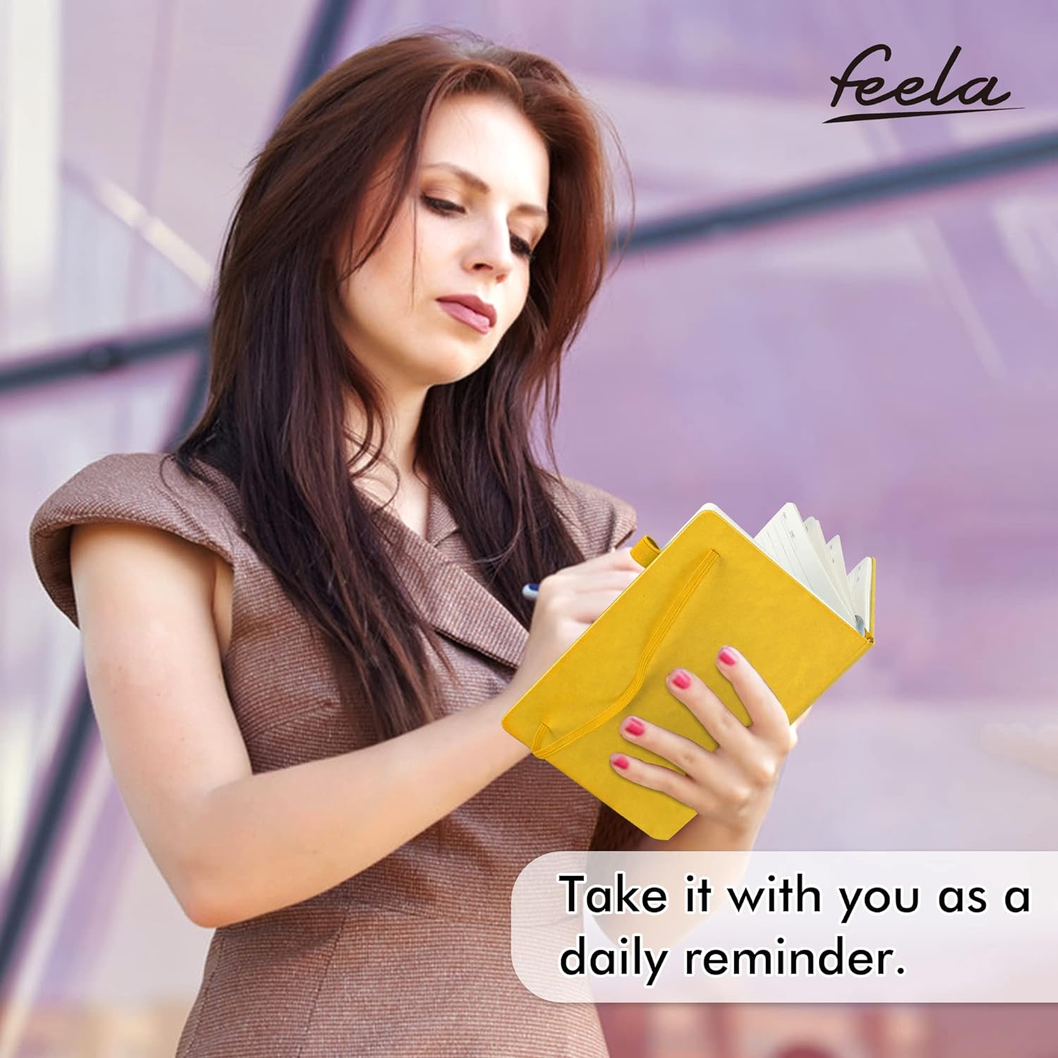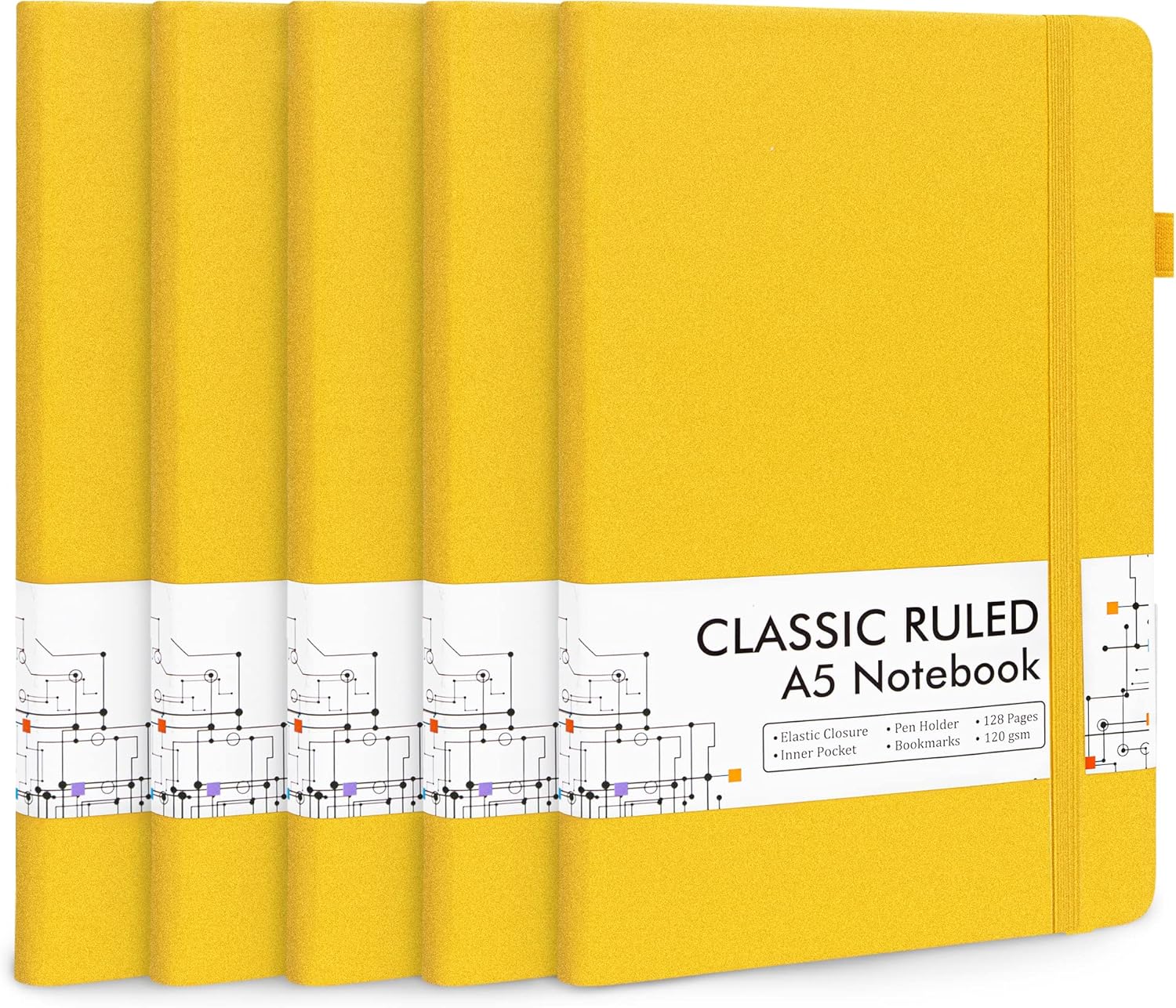 feela 5 Pack Journal Notebook Bulk for School, Hardcover Business Notebooks Classic Ruled Lined Journals with Pen Holder for Work Note Taking, with 5 Black Pens, 120 GSM, 5.1”x8.3”, A5, Yellow