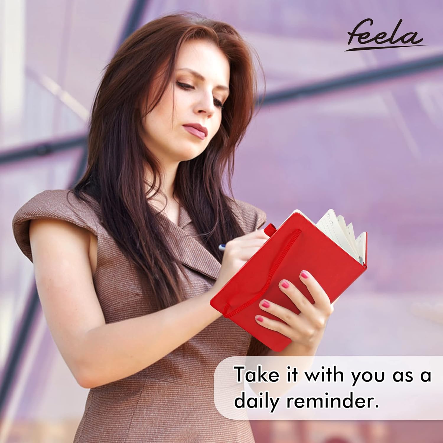 - Feela 12 Pack Classic Ruled Notebooks contains 12 classic red ruled sturdy cover notebooks and 12 Black Retractable Pens. Each of the notebooks measures 8.3” x 5.1”, which is perfect to carry and easily held by young girls and boys. These black cute pens are customized to be placed in the pen holder, which is pretty convenient.