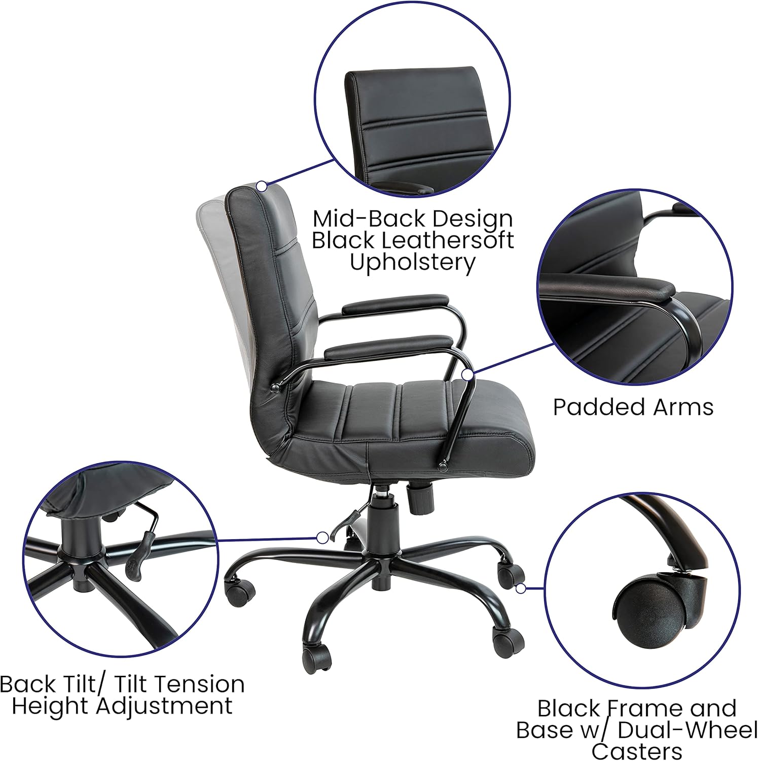 - UPGRADE YOUR WORKSPACE: Boasts a soft mid-back black LeatherSoft back and seat paired with a black metal base and armrests all highlighted by an attractive horizontal line stitching to boost your desk or work area with modern style