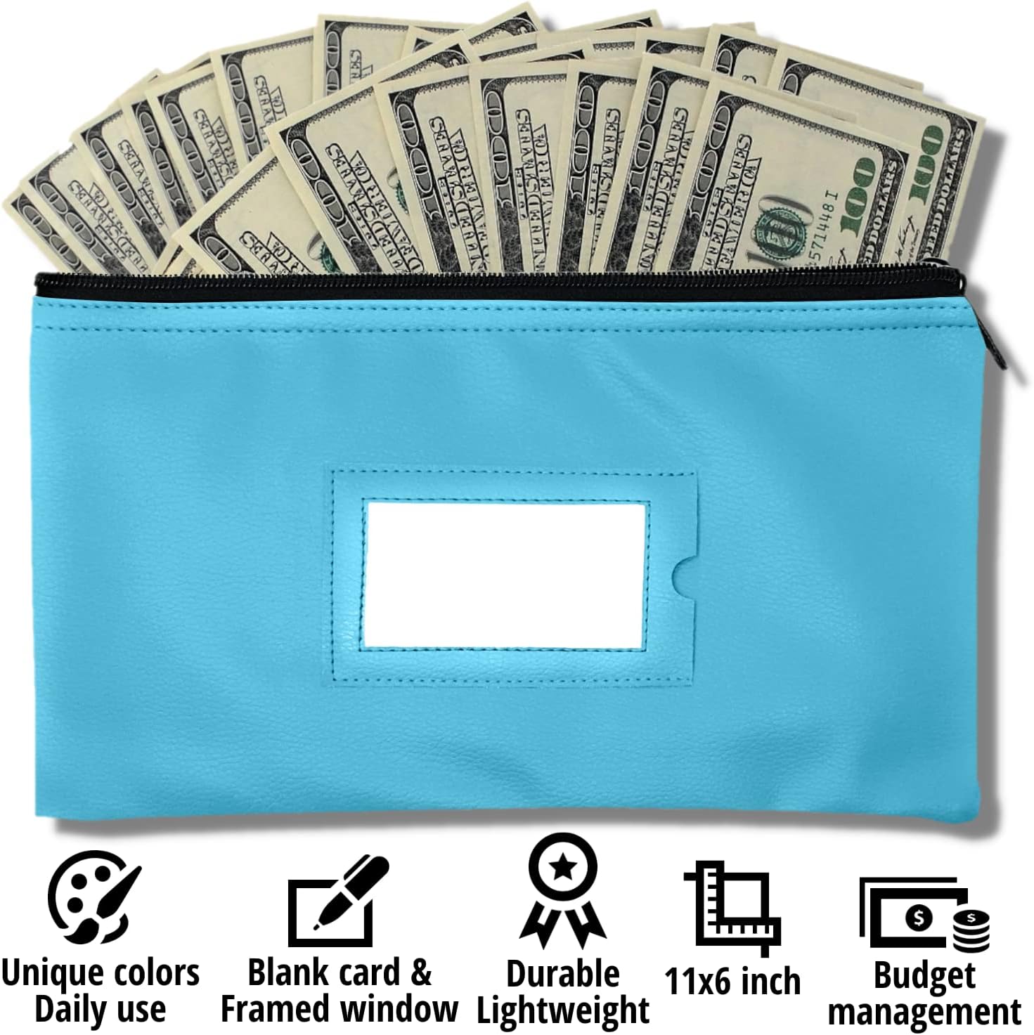 Money Bank Deposit Bag with Zipper | 11x6 inch | Light Blue | Durable Leatherette Money Cash Coin Check Wallet Pouch for Men & Women with Framed ID Window and Blank Card | by GIDABRAND (3)