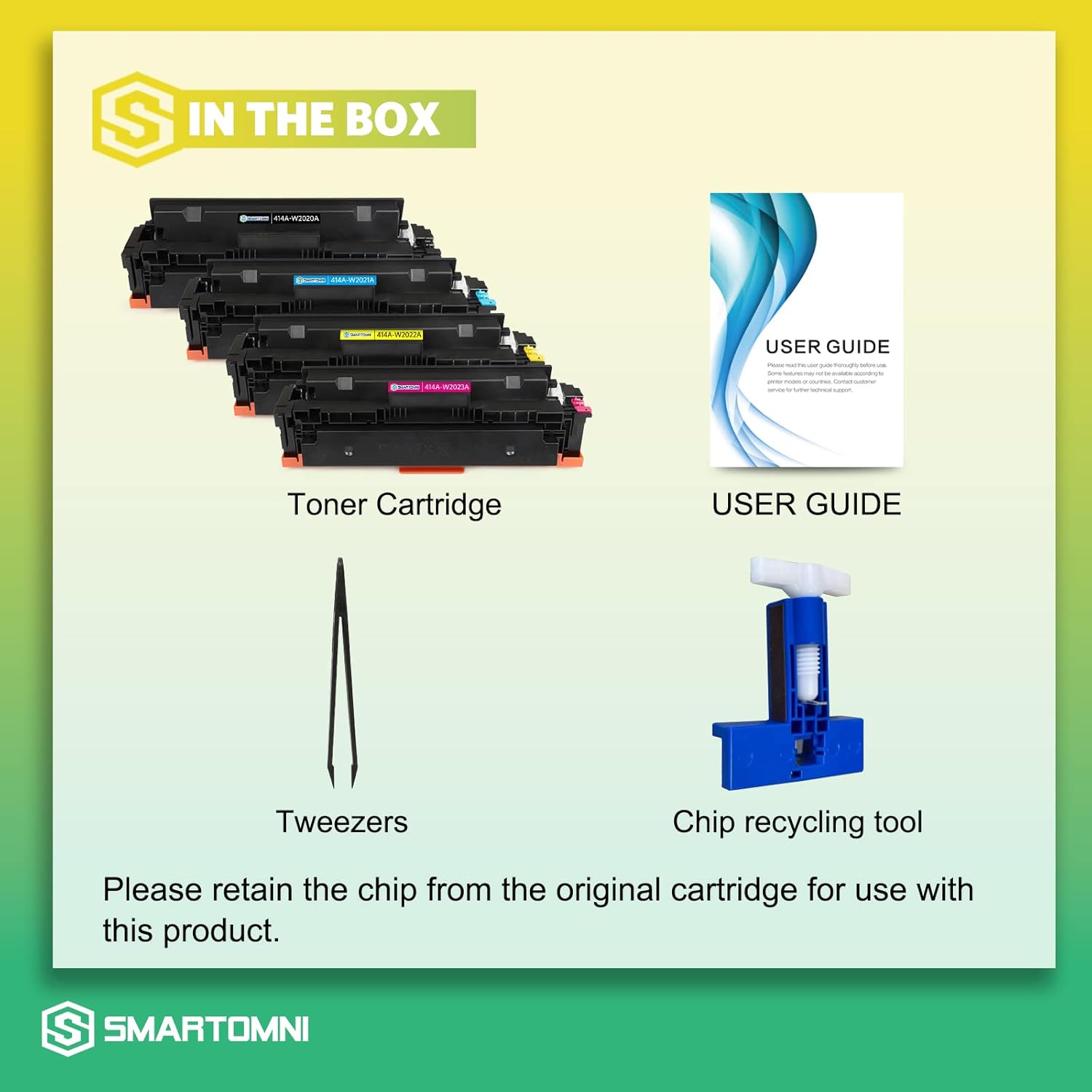 - Multiple Protective Packages: It includes 4 packs S SMARTOMNI compatible HP 414A Toner Cartridges (1 Black W2020A / 1 Cyan W2021A / 1 Magenta W2023A / 1 Yellow W2022A)