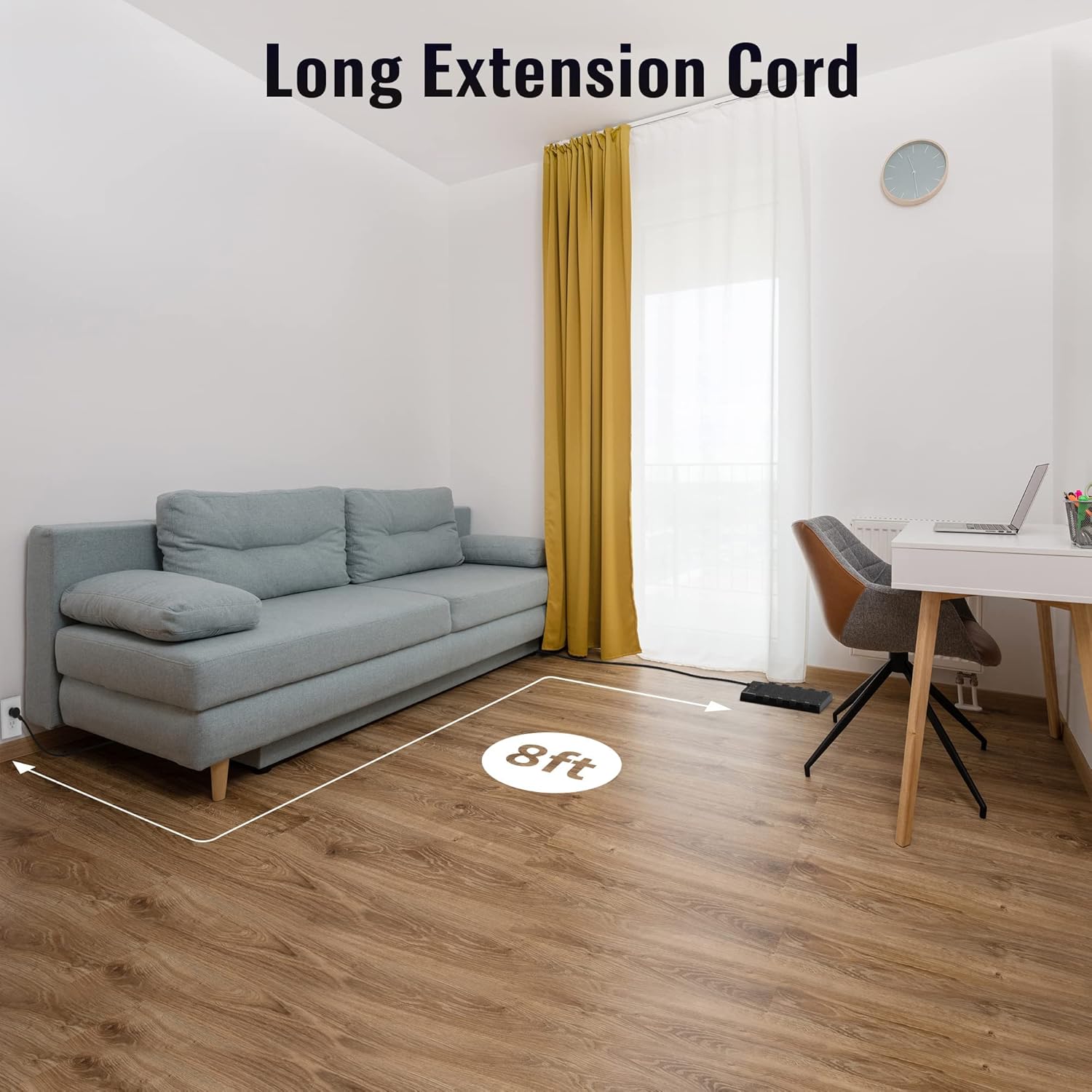 - 【Mountable and Flat Plug】 There are 4 keyholes on the back, so you can mount this flat extension cord onto the wall or furniture easily, 4 screws and 1 marking sheet included. The 45°angled flat plug fits perfectly in narrow spaces like behind a bookshelf, nightstand, or the TV, and does not cover the bottom receptacle of a duplex outlet. The 8 ft heavy duty extension cord (1875W/15A) delivers power where it is needed.