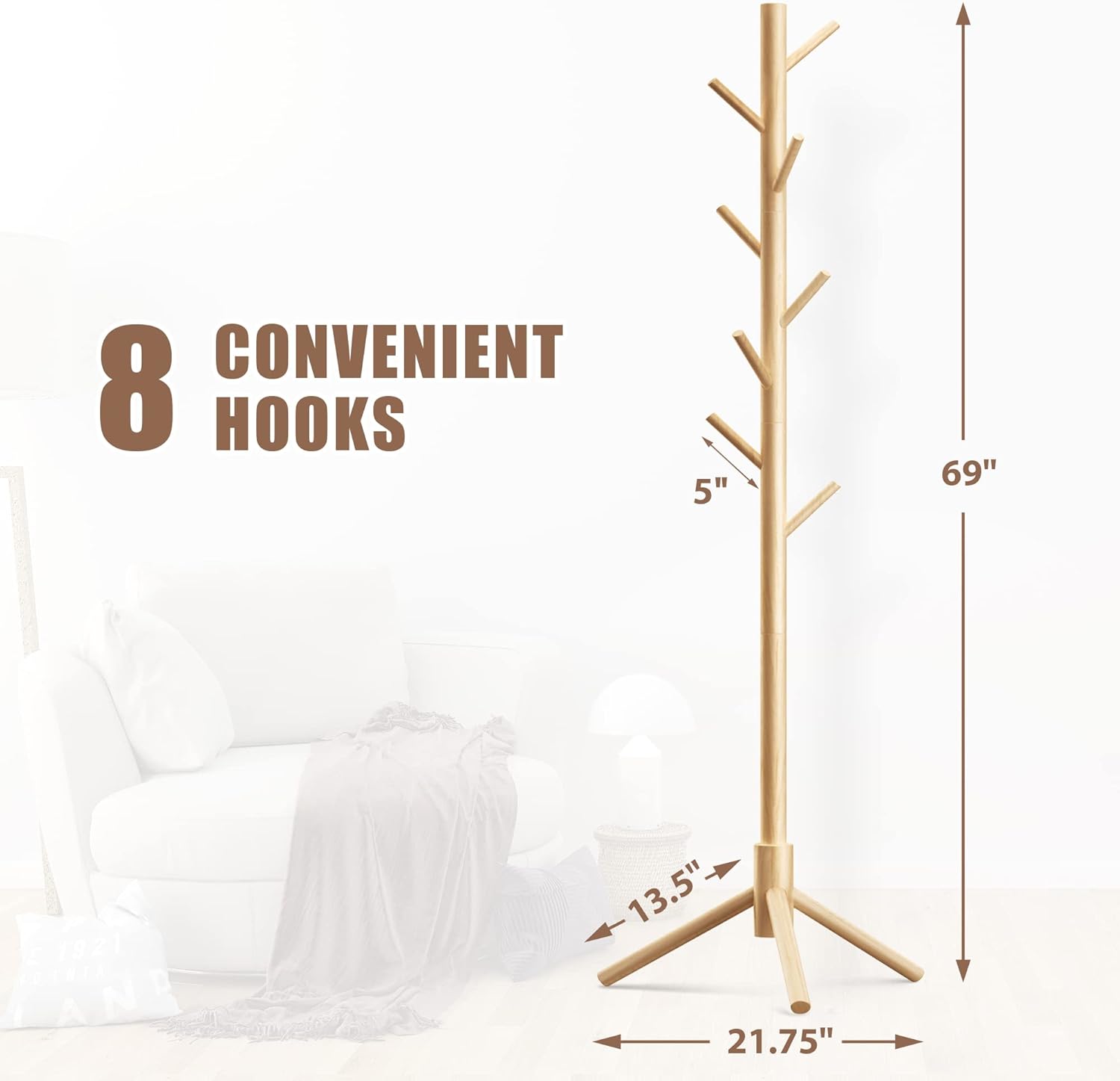 Haddockway Wooden Coat Rack Stand with 8 Hooks New Zealand Pine 3 Adjustable Coat Standing Tree Easy Assembly for Coats, Hats, Scarves and Handbags for Entryway, Hallway, Bedroom, Office