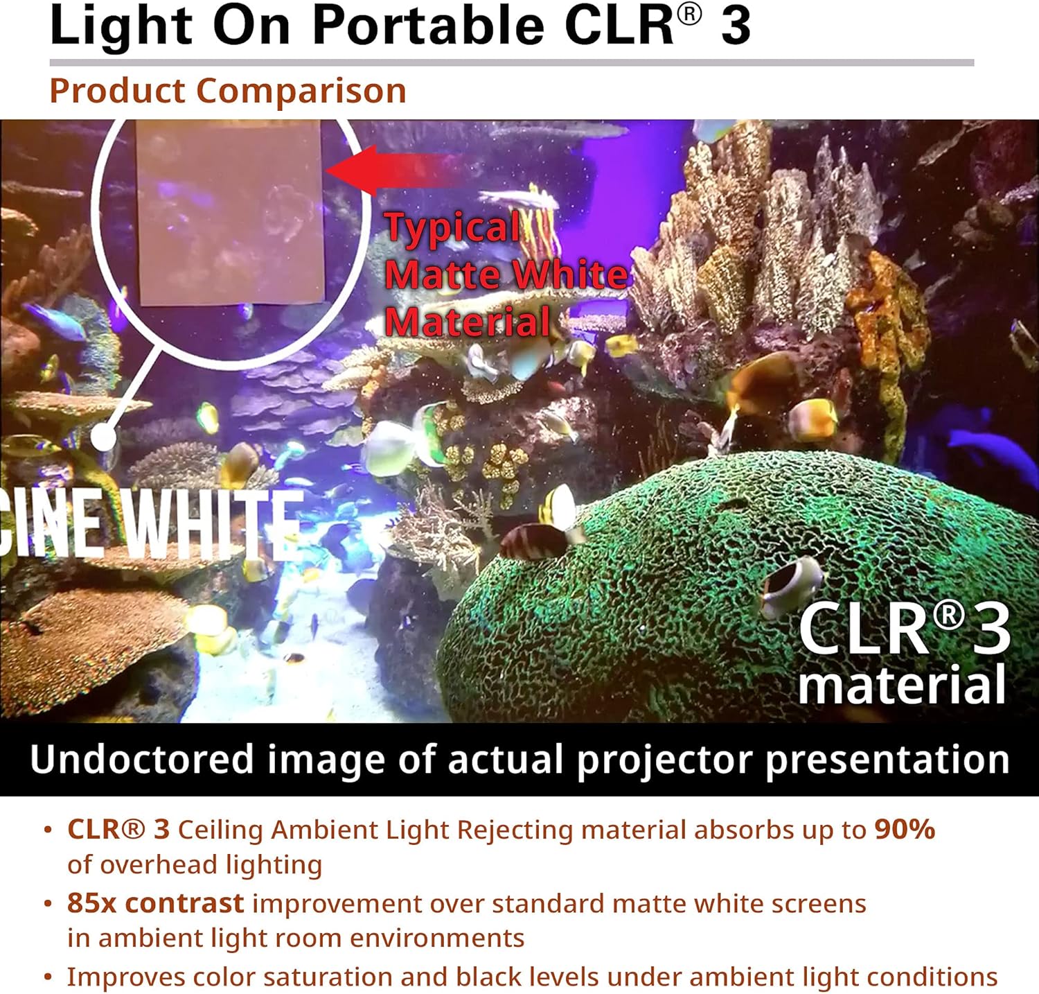 - 【Unmatched State-Of-The-Art Screen Material】Screen Material: CLR 3, Ceiling Ambient Light Rejecting (CLR/ALR) Technology Features a 170° Viewing Angle with 0.8 Gain - Exclusively for Ultra-short Throw (UST) tabletop/bottom mounted projectors – 4K/8K Ultra HD and Active 3D Ready. Rejects 90% of Overhead Light while Enhancing Contrast 75x Compared to Standard Matte White Screens.