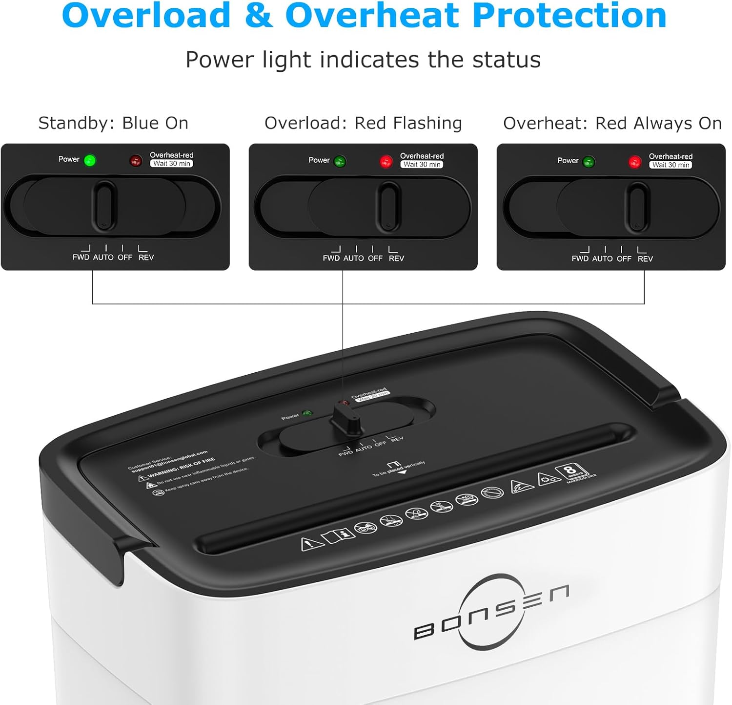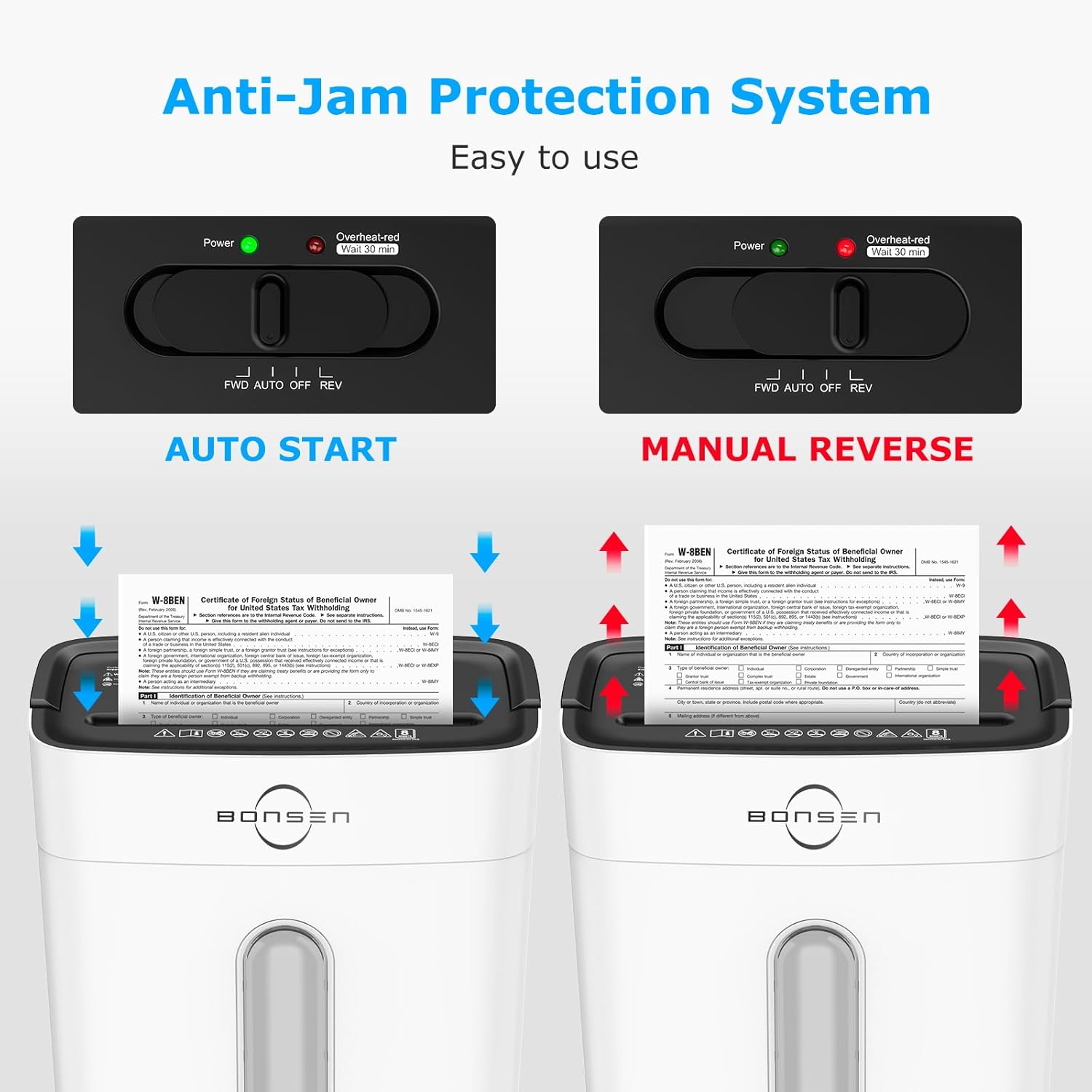 - Jam Proof System and Overheating Protection: Auto start/stop and manual-reverse function protect the machine from the frustration of paper jams; if shredder runs continuously over the max time (5 minutes), it will automatically shut off to protect the machine from overheating