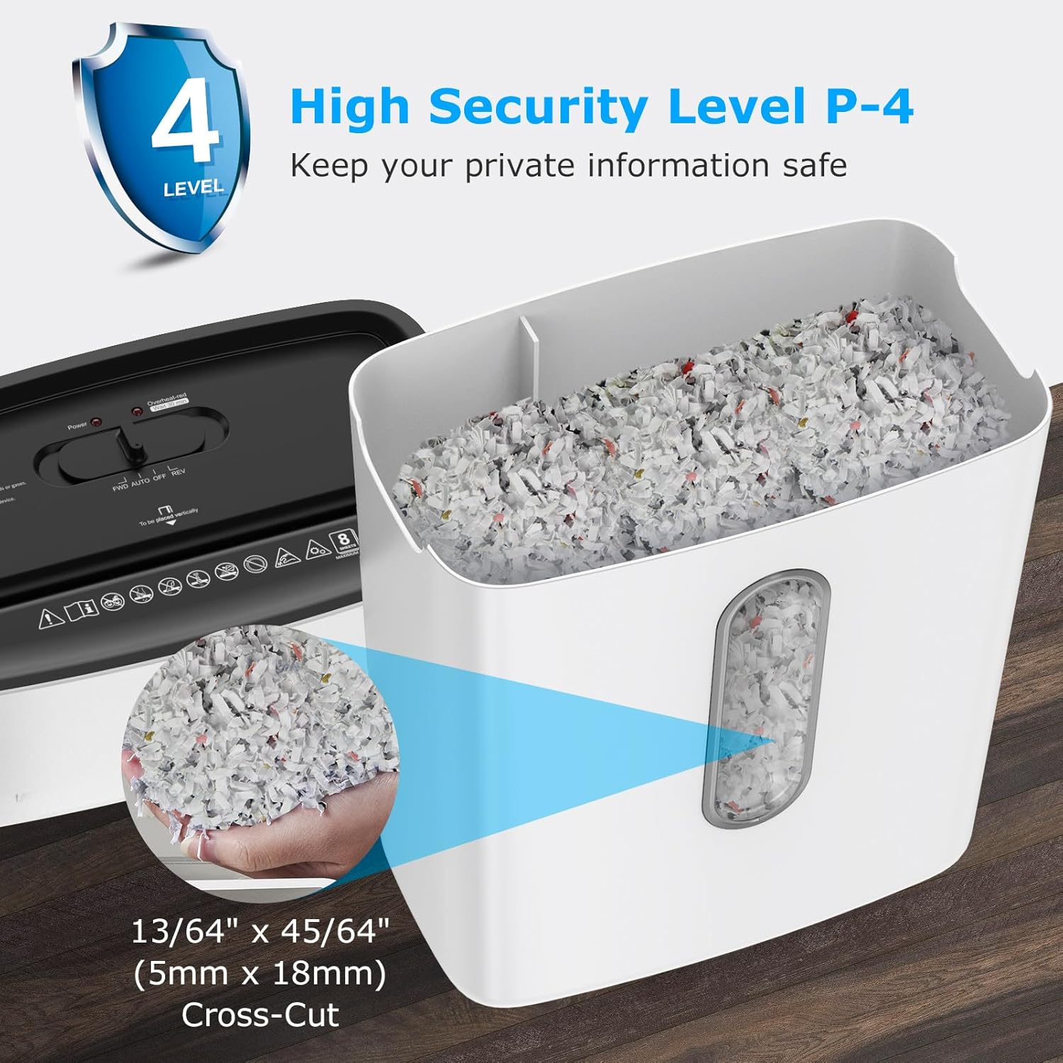 - 8 Sheets Cross-cut Shredder: Shreds up to 8 sheets of paper at one time into tiny pieces measuring 13/64'' x 45/64'' (5 x 18 mm) at 5.24ft / min shredding speed, shreds staples / credit cards / clips / mails as well; meets security level P-4, keep your sensitive information safe
