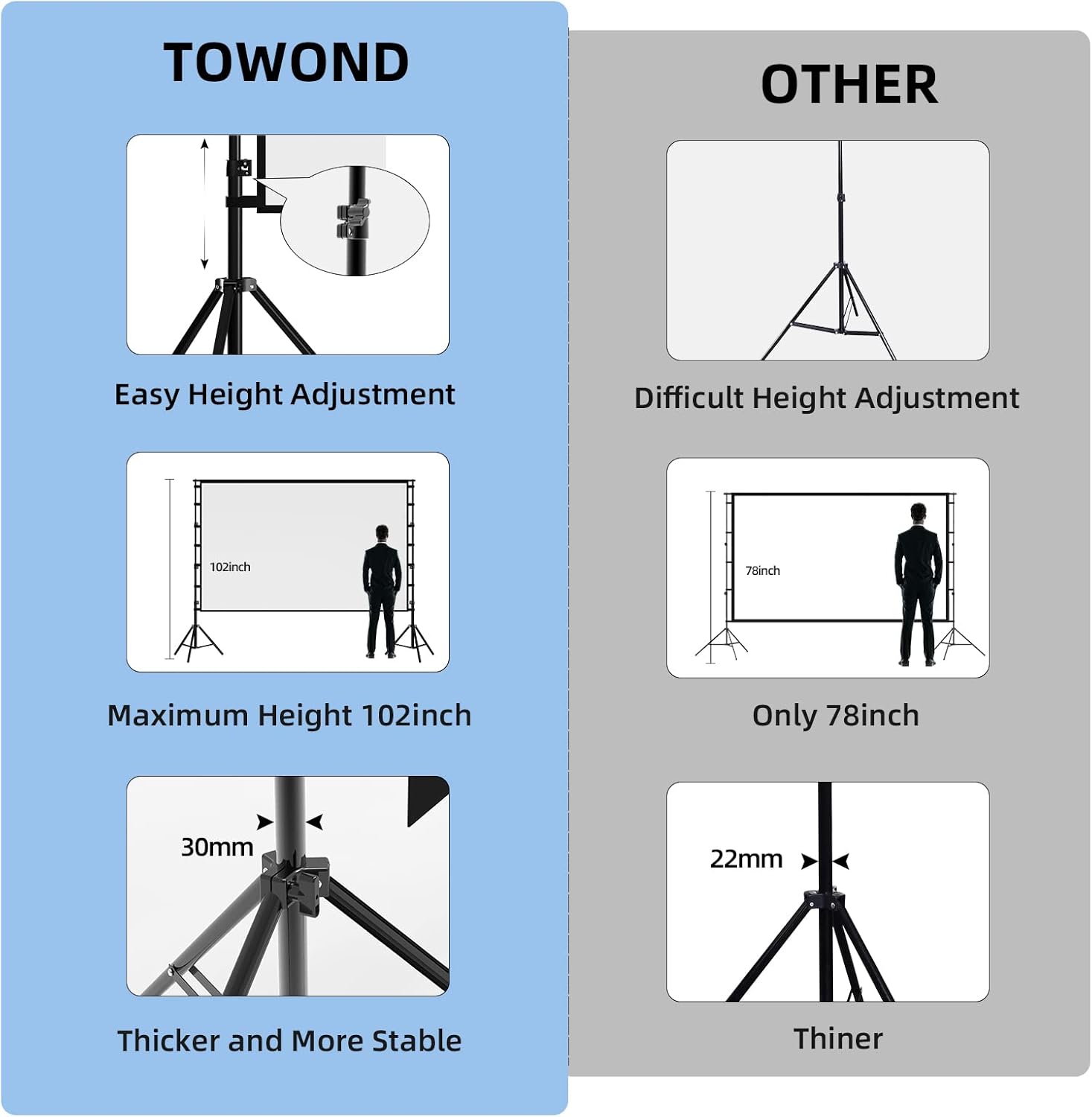 TOWOND Projector Screen and Stand, 150 inch Indoor Outdoor Projection Screen, Portable 16:9 4K HD Rear Front Movie Screen with Carry Bag Wrinkle-Free Design for Home Theater Backyard Cinema