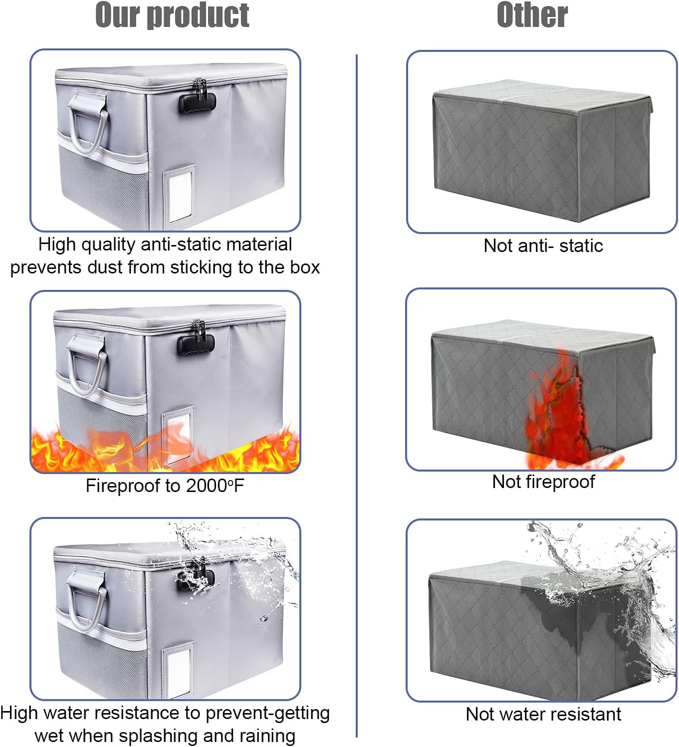 - Multiple security protection: Compared with ordinary box, our fireproof storage box is anti-static on the outside, which can prevent dust from sticking to them. Design with a strong grab handle for easy lifting. High quality PVC boards increase the rigidity of the box so you can easily sit on it or stack multiple boxes together.(Does not include folders)