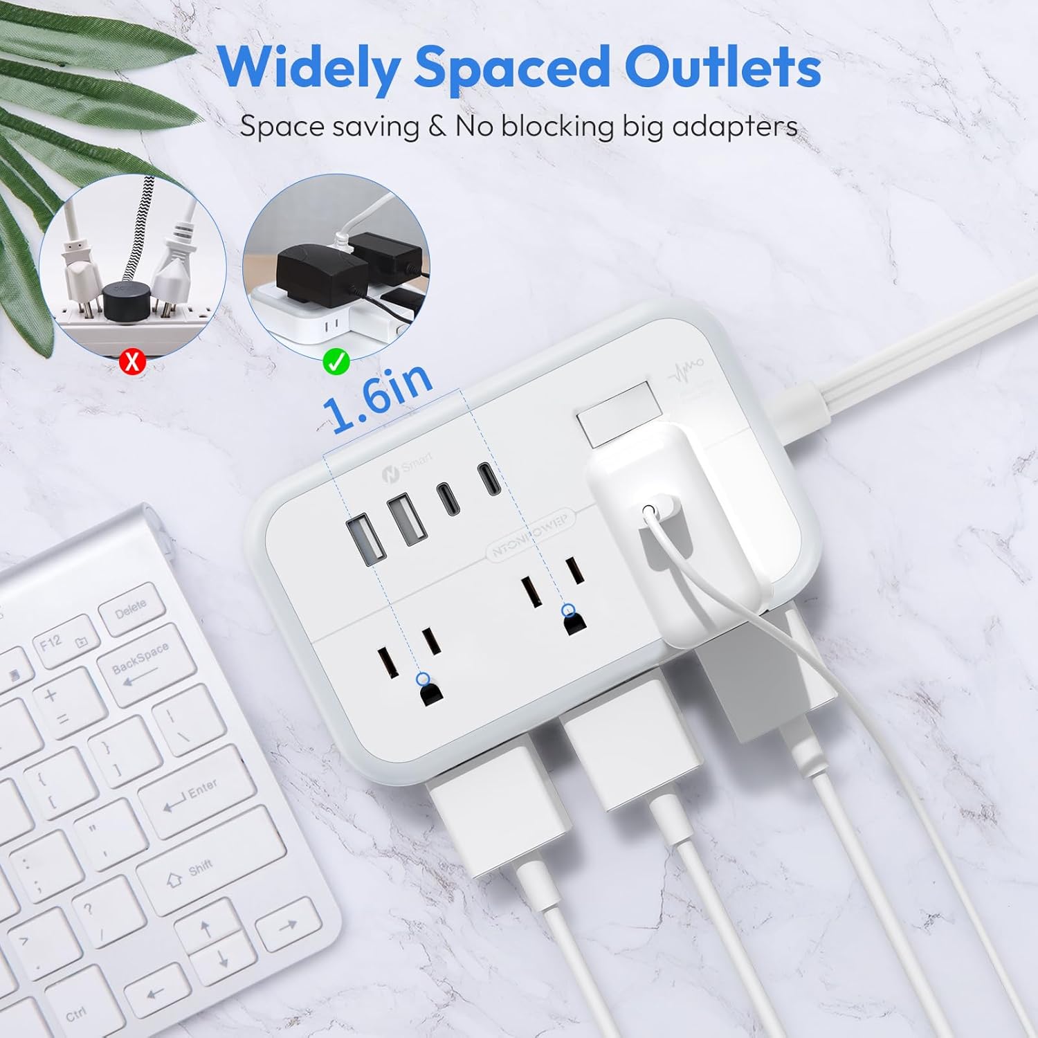 - 【 2 Mounting Methods & Wide Space 】 The two mounting holes(2 screws and mounting template included) allow this wall mount power strip to be installed in various applications horizontally or vertically, like workbenches, wall, counter, dorm and more. Saving space for you. The outlets are separated enough to fit big transform plugs without blocking each other(preferably < 1.6” wide).