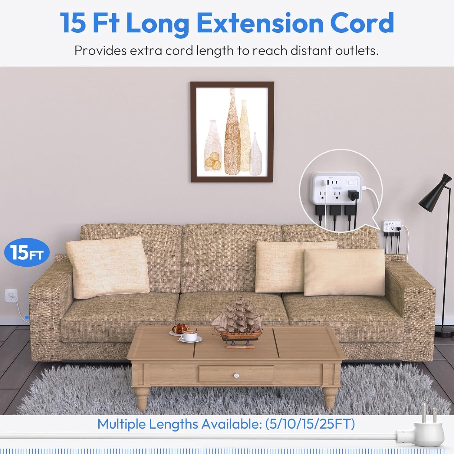 - 【10-IN-1 Power Strip Surge Protector with USB Ports 】This 15 ft 2-side outlet extender with 6 outlets 4 USB charging ports(Total 5V/3.1A) can power up to 10 devices simultaneously. With built-in Smart IC technology, the multi plug extension cord with USB ports can auto-detect and deliver appropriate current to your devices phone, iPad, tablet, kindle, or lamp, WITHOUT a variety of converters. This USB power strip supports a range of 100-240V. Ideal for Home, Office, and Dorm Room essentials.