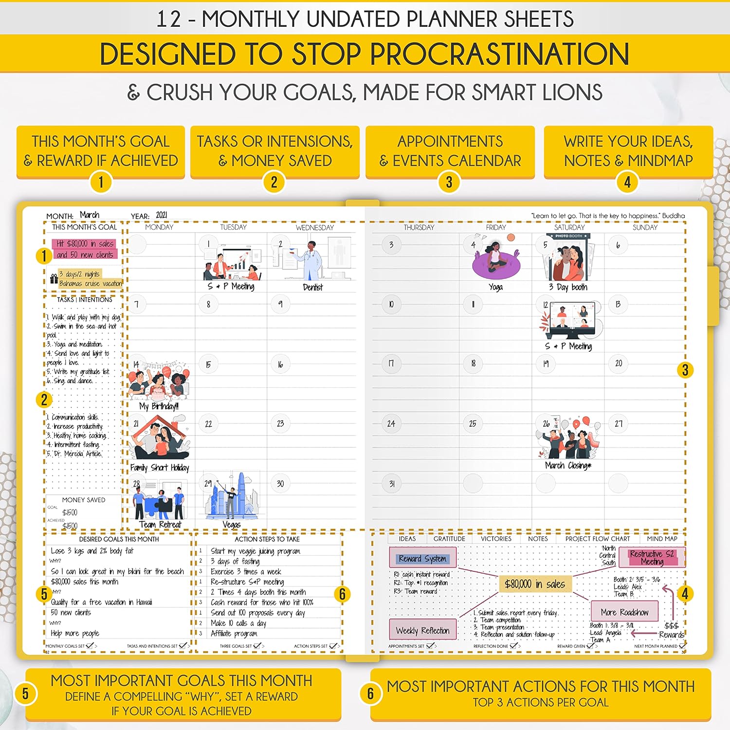 - UNDATED PLANNER - All the tools for success you need to create the life you've always wanted. This large planner measures A4 Size (8.3 x 11.7 inches) and boasts thick 100 gsm paper. It features a Horizontal Planner layout, offering 256 pages for life transformation, including 53 weekly spreads, 12 monthly planning overviews with reflection sections, 31 dotted journal pages, habit trackers, mind maps, morning and evening routines, inner pockets, pen holder, and comes in a gift box. This life planner is undated, serving as a daily, weekly, and monthly planner, giving you the freedom to start your journey whenever it suits you best.