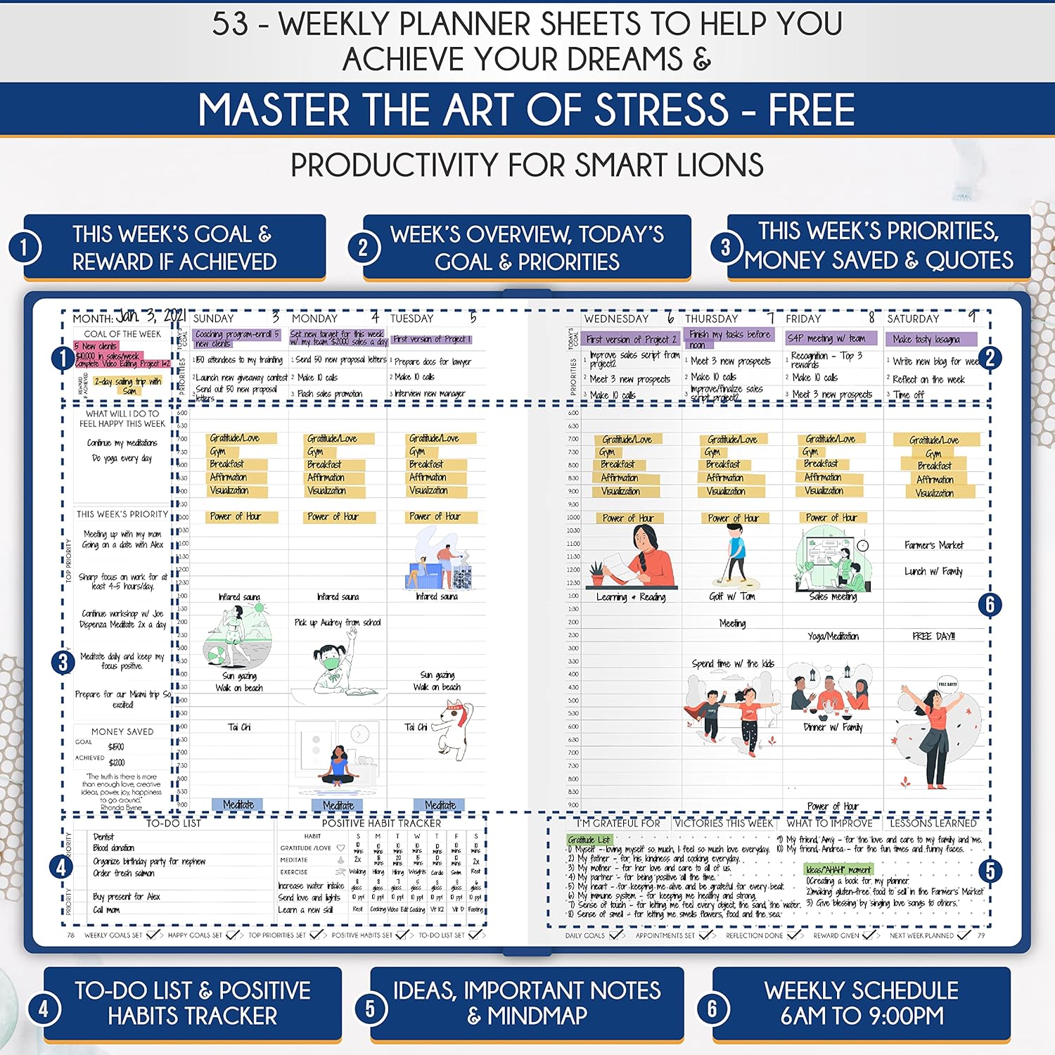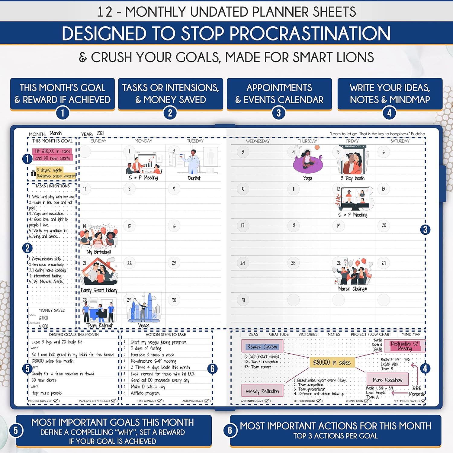 - UNDATED PLANNER - All the tools for success you need to create the life you've always wanted. This large planner measures A5 (8.5 x 6 inches) and boasts thick 100 gsm paper. It features a Vertical Planner layout, offering 256 pages for life transformation, including 53 weekly spreads, 12 monthly planning overviews with reflection sections, 31 dotted journal pages, habit trackers, mind maps, morning and evening routines, inner pockets, pen holder, and comes in a gift box. The planner comes with 539 productivity stickers that can be used to mark important dates, tasks, or milestones. This life planner is UNDATED giving you the freedom to start your journey whenever suits you best