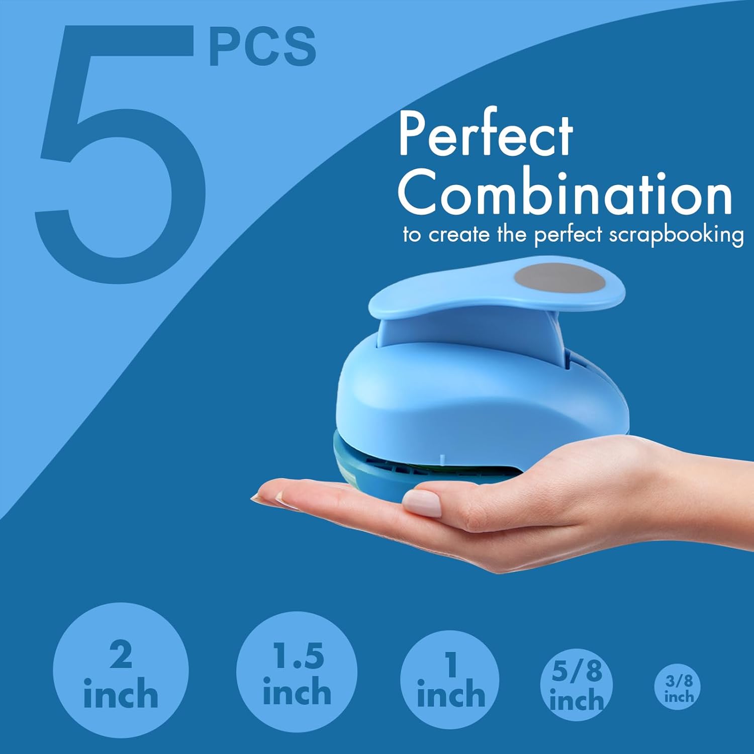 - 5 DIFFERENT-SIZE CIRCLE PUNCHES: This set of circle punches comes with five different sizes. The punch-out sizes are 2 inch, 1.5 inch, 1 inch, 5/8 inch, and 3/8 inch. It can help you create circle shapes for scrapbooks, photo albums, and other craft projects.