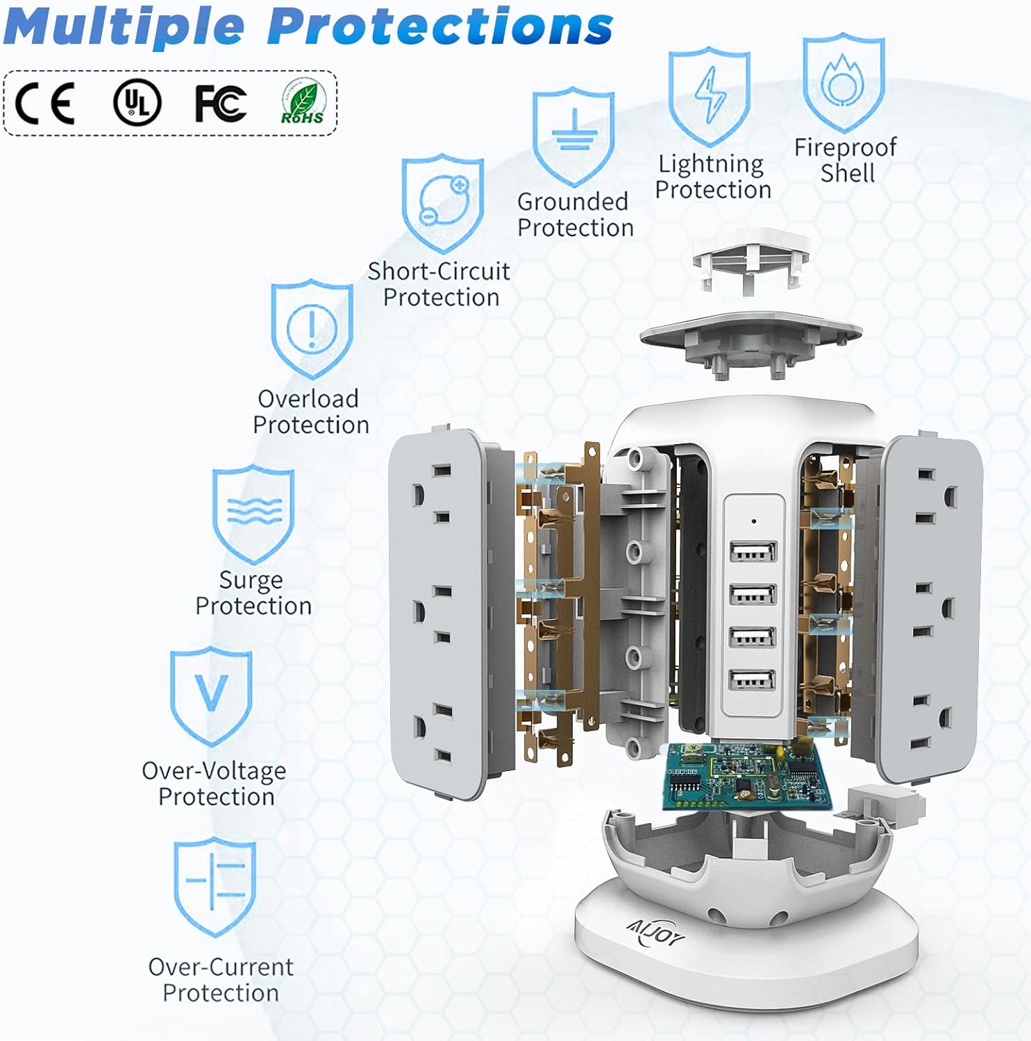 Power Strip Tower with USB Ports-AiJoy Surge Protector with 12 AC Outlet and 4 USB Ports, 10 Feet Extension Cord, USB Charging Station with Overload Protection, Office Desk Supplies, Dorm Essentials
