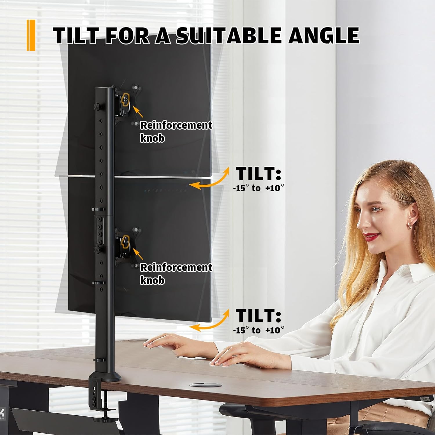 - Ergonomic Benefits ☞ Raise monitors to ergonomic height, relieving the strain on the neck, back and shoulder; 2 stacking monitors configuration enhances the work efficiency