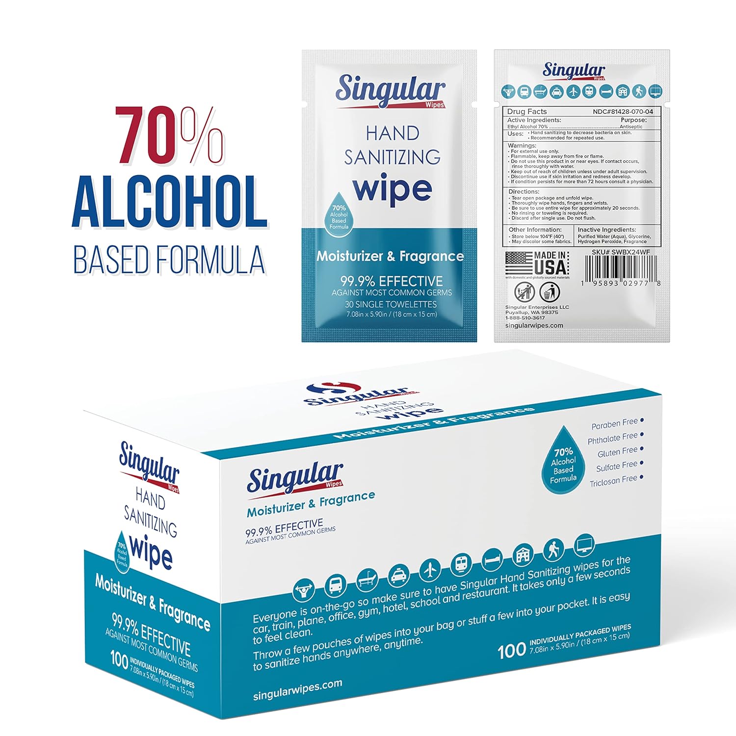 Hand Sanitizing Wipes Travel Size by Singular Wipes – 100ct Individually Wrapped | Fresh Citrus Scent, Moisturizing, 70% Alcohol Wipes | Travel, Office, School, Home | Made in USA