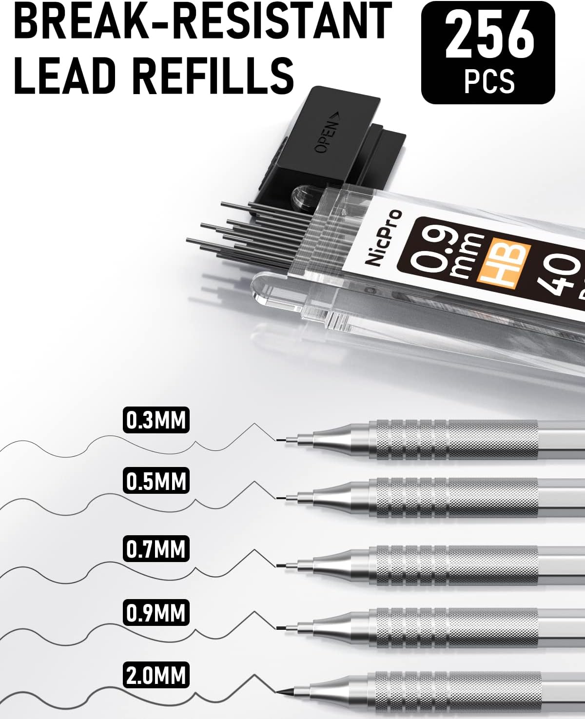 Nicpro Metal Mechanical Pencil Set, 5 PCS Art Drafting Pencils 0.3, 0.5, 0.7, 0.9 mm & 2mm Graphite Lead Holder For Sketching Drawing With 9 Tubes (4B 2B HB 2H Colors) Lead Refills Erasers Case