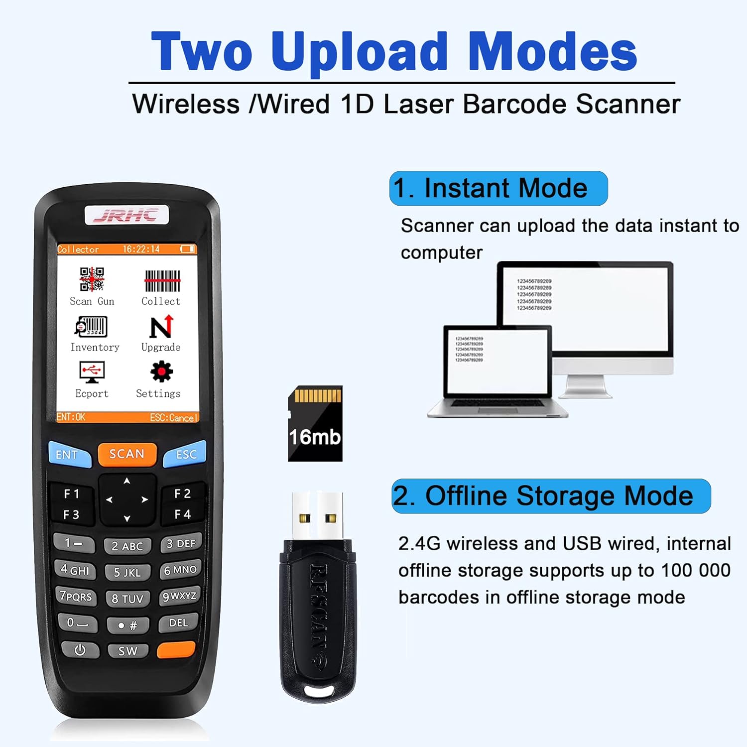 1D Wireless Bar Code Scanner, JRHC Laser Barcode Scanner Inventory Scanner Reader with Screen Data Collector Portable Reader Scan Gun Cordless for Store, Supermarket, Warehouse, Library, Medical